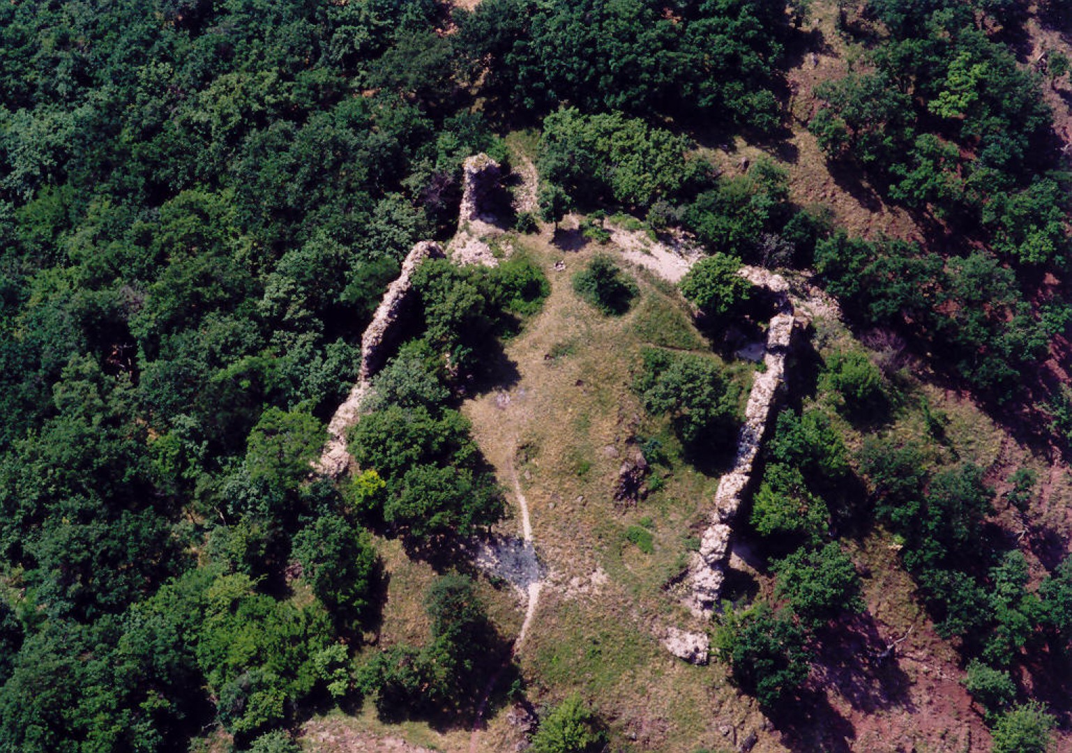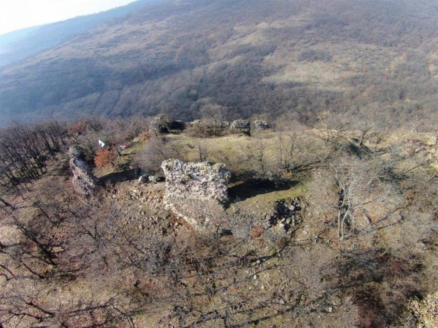 A téglalap alakú építmény keleti és nyugati oldalfalának maradványa 32 méter hosszú, déli és északi fala, pedig 25 méter. A keleti fal vastagsága 2 m, magassága, pedig 6 méter lehetett, a többi fal, amely meredekebb hegyoldalra épült, 180 centiméteres volt. Az északi rész falait – ahol a bejáratot kialakították – ma már a romtörmelékek teljesen eltakarják.