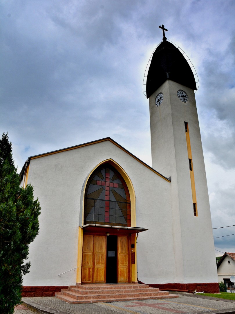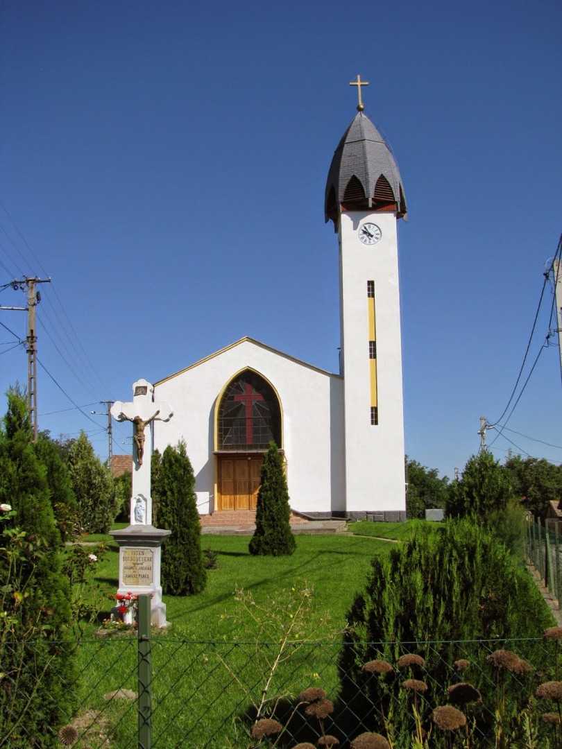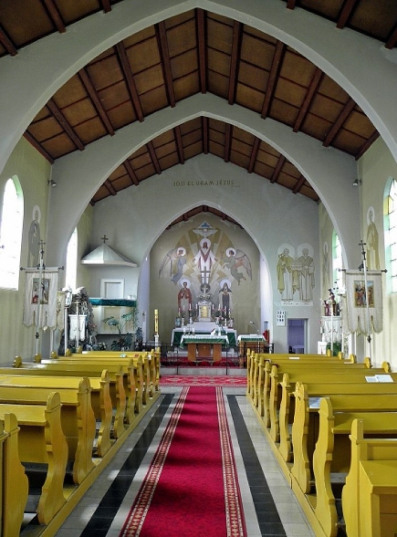 A templomot 1978-79. években renoválták és kifestették Szilágyi János és fia András festőművészekkel. A szentély falára festett főoltárkép közepén a Szentháromság szimbólumait láthatjuk. Legfelül a háromszögbe zárt Istenszem a Mennyei Atya szimbóluma, alatta a galamb a Szentlélek szimbóluma, majd pedig a feltámadt Jézus mint az emberiség megváltója áll a földgolyón amelyből a Golgota 3 keresztje magasodik ki. Mellette két oldalt egy –egy angyal a Szentmise áldozat szimbólumait tartja a kezébe, a kenyér szimbólumát a búzát és a bor szimbólumát a kelyhet. Alul két szent alakja látható. A régi templom védőszentjének Szent István vértanúnak alakja és a mai templom védőszentjének Avilai Nagy Szent Teréznek az alakja. A főoltár feszülete még a régi templom értékes darabja, alatta a fájdalmas Szűzanya szobrával.