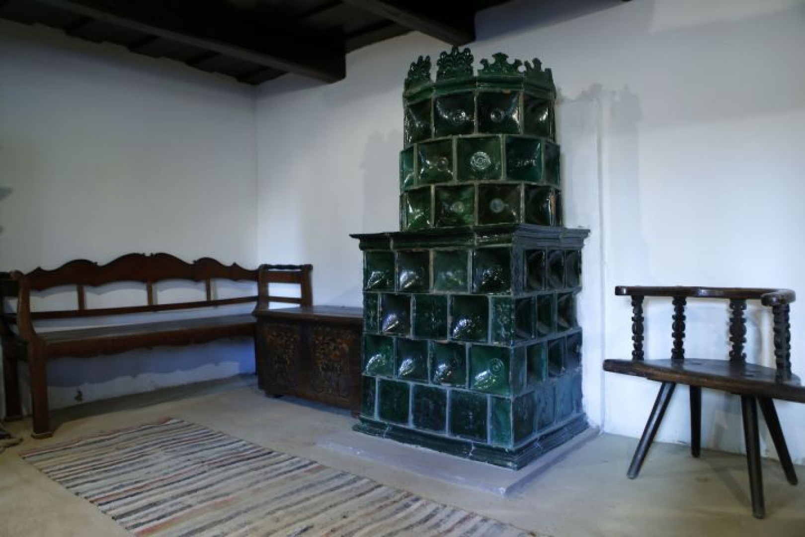 A bejárattól jobbra áll az 1854-ben veszprémi kályhásfazekas által készített, kívülről fűthető, zöld mázas kályhaszemekből vagy kupákból felrakott szemes vagy fiókos kályha, felső részén csipkés koronával lezárva. Közelében áll a fából készült karosszék, a búsuló, amely többnyire a család legidősebb férfitagjának ülőhelye volt.
