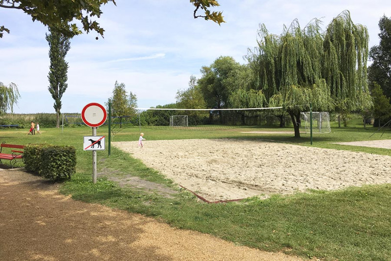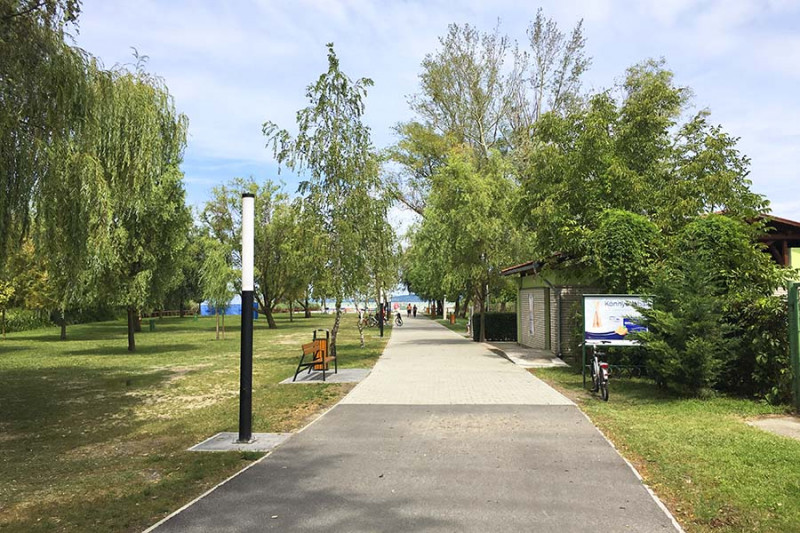 A „Mozdulj Balaton” egyik helyszíne. A Balaton kedvezőtlen iszapmozgása miatt egy hosszabb (kb. 30 m) bejárón lehet a vízbe jutni. A szezonban minden szombaton egész nap állandó animátor várja a helyszínen a jelentkezőket a különböző sportversenyekre – strandröplabda, kosárlabda, kispályás focilabda, tollaslabda. A bejáró mellett különböző sporteszközöket is telepítettek a sekély vízbe, ami különösen alkalmas a játékra, sportra.