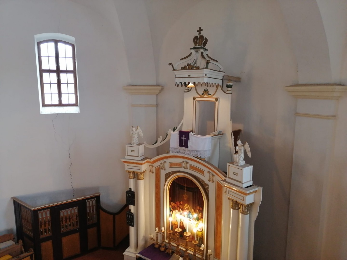 A templom felépülését egy évszám hirdeti , mely az egyhajós, félköríves szentéllyel záródó templom tornyát fedő hagymakupolán található.