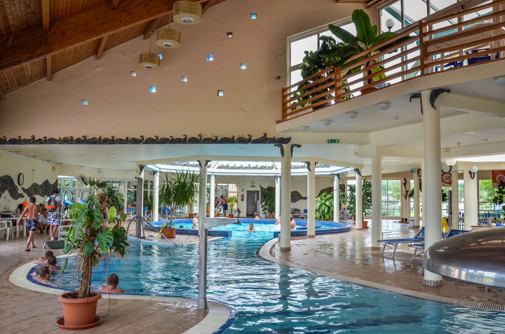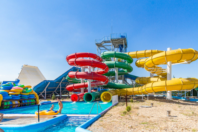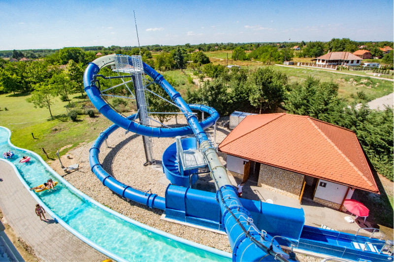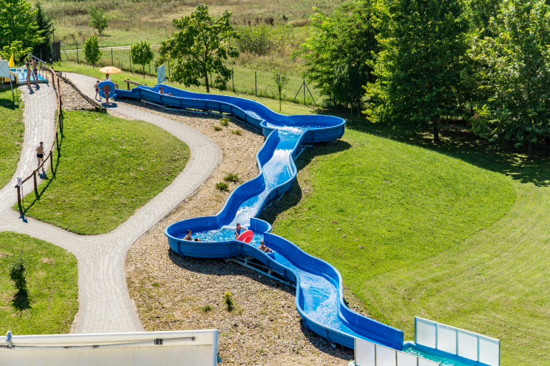 A fürdőből közvetlen átjárás biztosított a 18 csúszdás Aquaparkba, ahol extrém óriáscsúszdákkal és gyermekcsúszda szigettel várják a fürdőzőket.