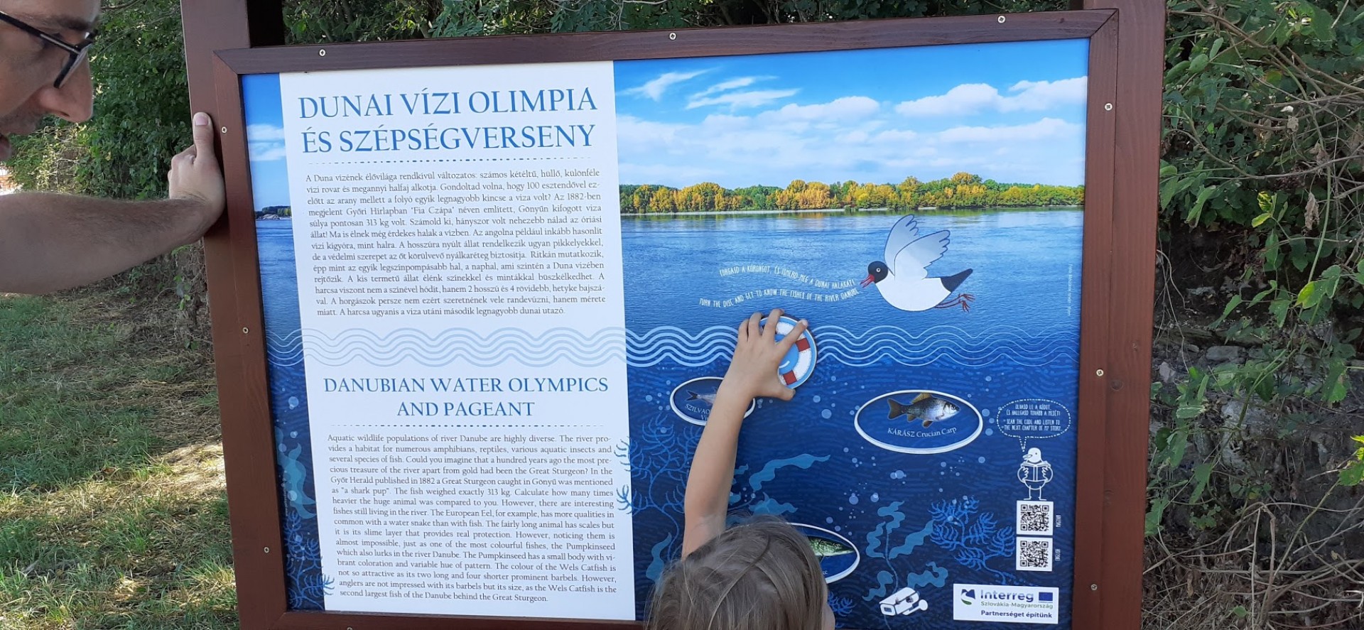 A tanösvényen interaktív, magyar és angol nyelvű táblák vezetik a látogatókat. A séta minden korosztály számára élményt nyújt. Valaki a panorámában gyönyörködik az új padokon ülve, mások szívesen elolvassák a helytörténeti érdekességeket, és biztosan akad olyan is, aki az okos telefonja segítségével filmet néz, applikációt tölt le, vagy lejátssza a Gönyűről szóló mesét a család apróságainak. A gyerekek figyelmét nemcsak a mese köti le, hanem a táblákba épített játékok is.