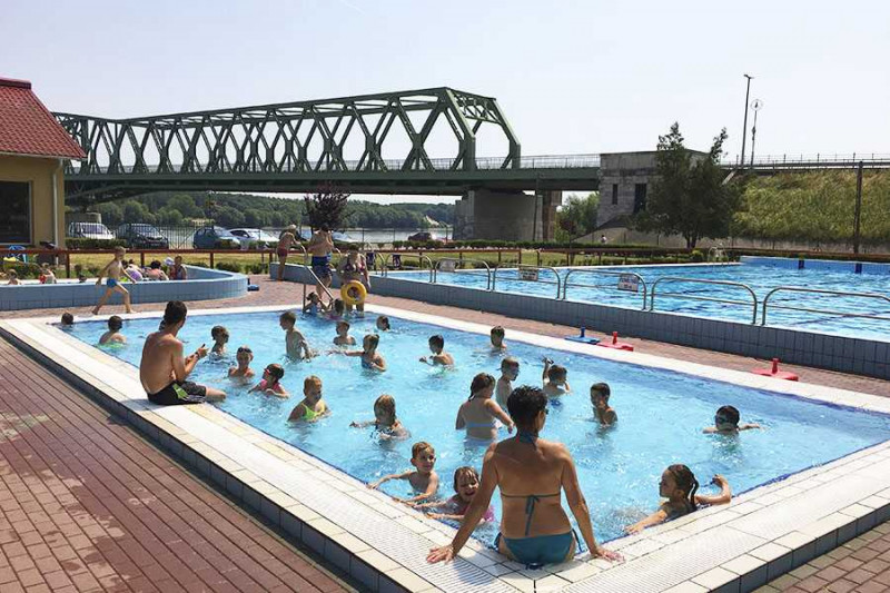 A Gyógy-és Strandfürdő a városközponttól 400 méterre a Dunán átívelő Beszédes József híd lábánál, közvetlenül a folyó parton van. A Kemping pedig pár száz méterre feljebb, szintén a Duna parton található.