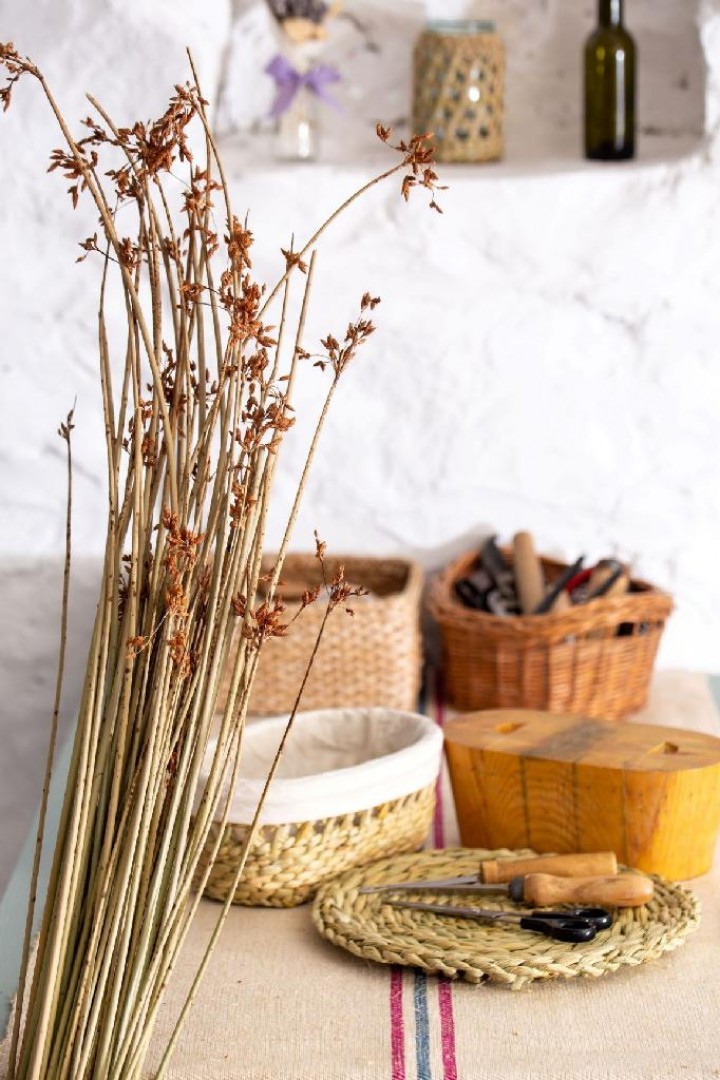 Munkáimat a természet anyagjaiból fonom, elsősorban gyékényből, kákából, de használok csuhét, levendulást és szárított virágokat is. A felhasznált növényeket én gyűjtöm be, gondosan odafigyelve, hogy a legjobb minőségű alapanyagok legyenek felhasználva.