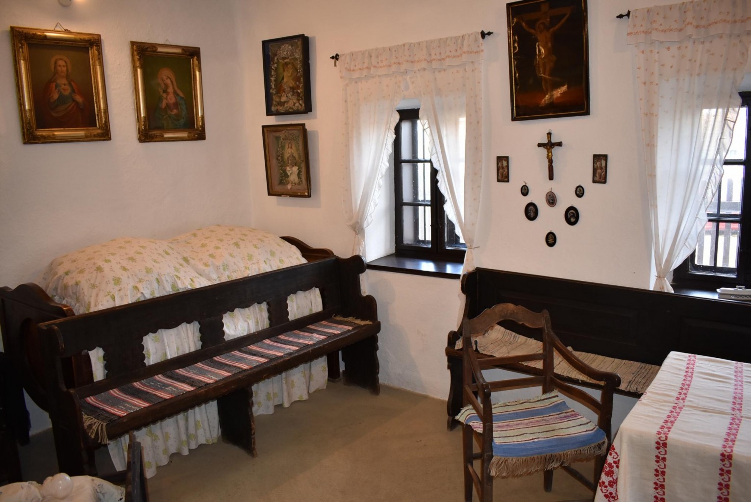 Belépve a kiskapun feljutunk a tornácra, amelynek ereszét markáns faoszlopok tartják, melyek régen „darulábasak voltak”.