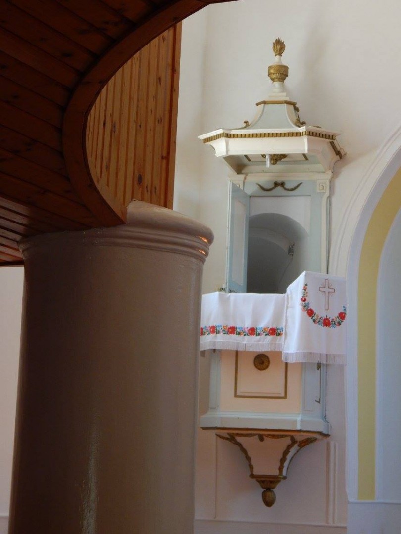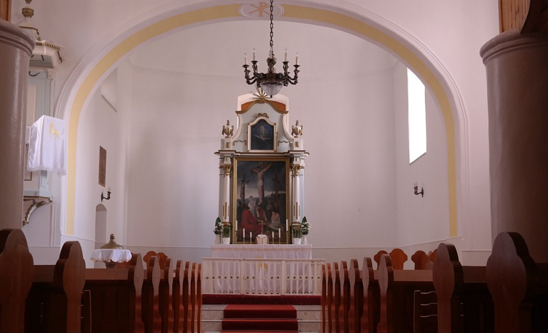 Az egyhajós templom középen befelé ívelő kórusát két oszlop tartja. A hajója tükörboltozatú, az oltára copf stílusú.