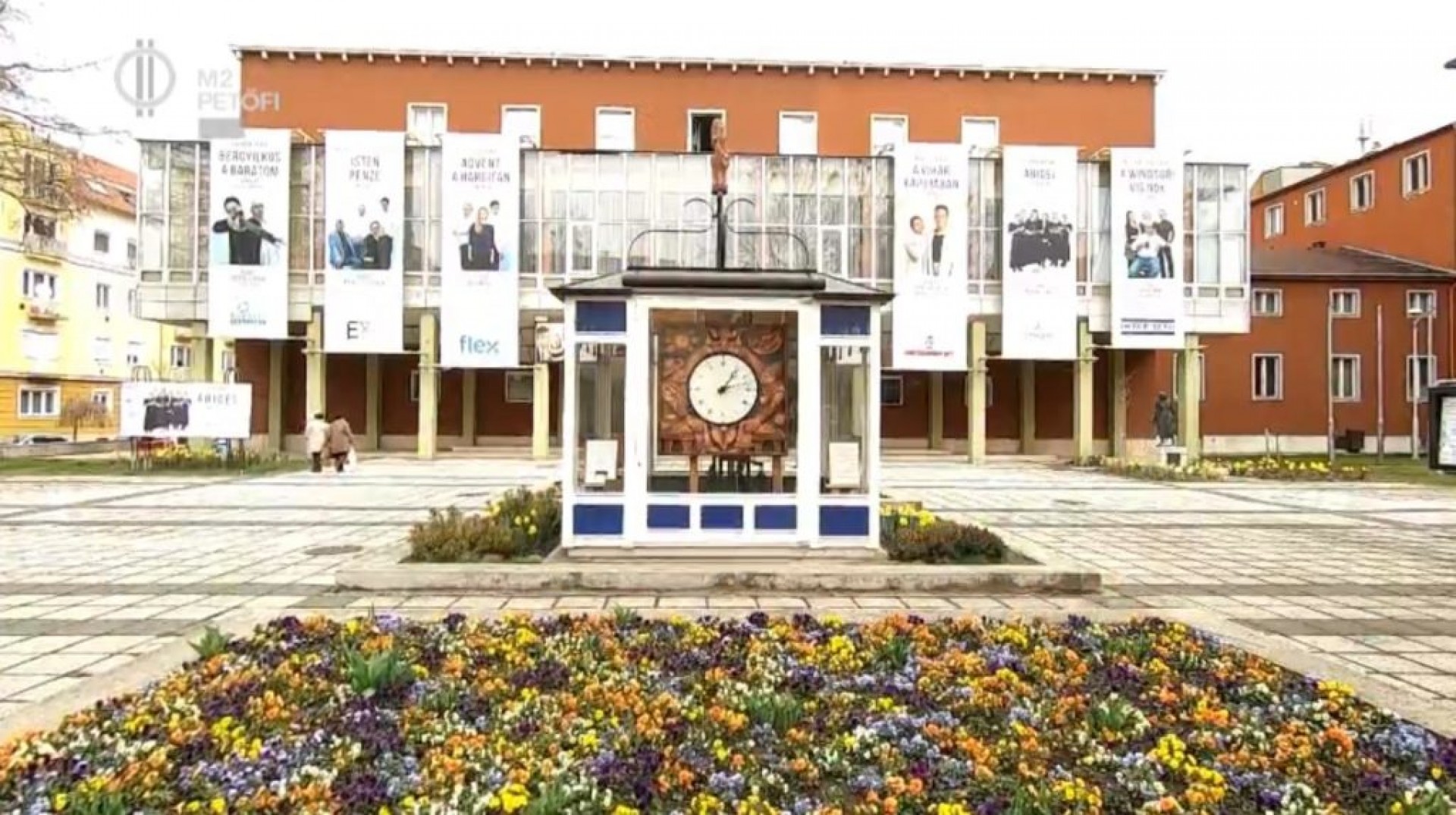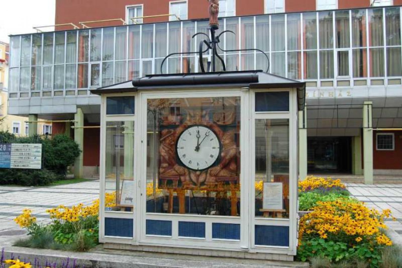 A Hevesi Sándor Színház előtti téren található óra működése a világon egyedülálló módon, egy üvegházon belül látható. Maga a gépezet Szerdahelyi Károly tervei alapján került kivitelezésre: a 200 éves óraszerkezet egy 3 méter 10 centiméter széles üvegkalitkába került, a súlyok és az ellensúlyok pedig egy három méter mélységű aknába ereszkednek a föld felszíne alá. A számlapját a város szülötte, Németh János keramikus tervezte.
