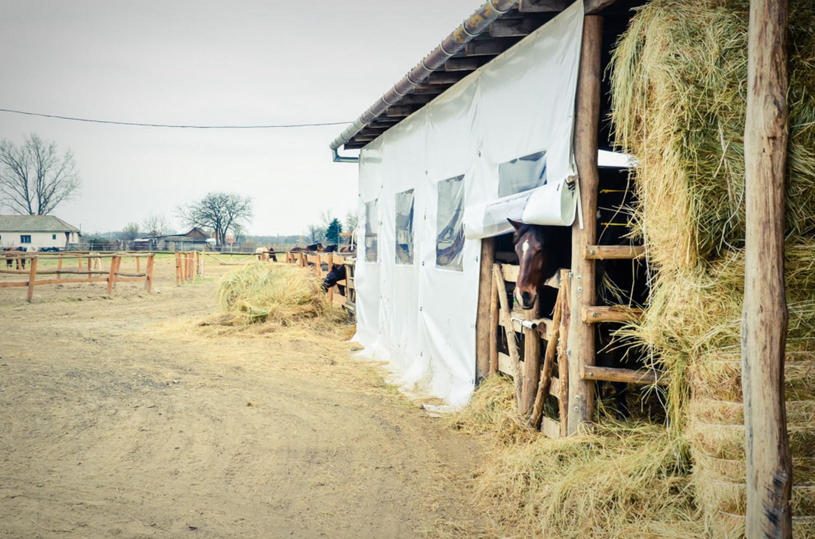 Lovak bértartása (Bokszos tartás egy korszerű, új istállóban, nagy, füves legelővel, patamosóval, szellőztető és tűzvédelmi berendezéssel.)