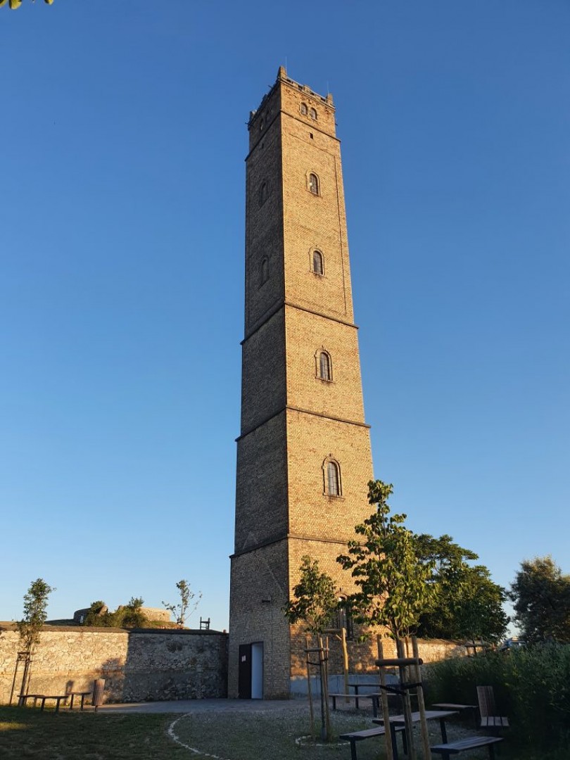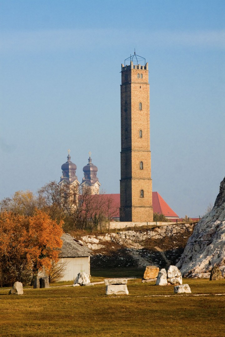 Kálvária kápolna és kilátó: A Tatára érkező már messze a város határától megpillantja a kopár dombtetőt, s a meredek, fehér sziklák ormán álló kálváriát, Schweiger Antal 1770 körüli alkotását.A kápolna és kilátótorony a barokk hangulatú városkép kialakításában nagy szerepet játszó Fellner Jakab emlékét őrzi. A kápolnát az egykori Keresztelő Szent János tiszteletére épült, majd később megsemmisült templom alapköveire építették újjá.A kilátótorony egykor sörétöntő toronyként funkcionált. 40 méter magas, tetejére közel 200 lépcsőfok vezet.