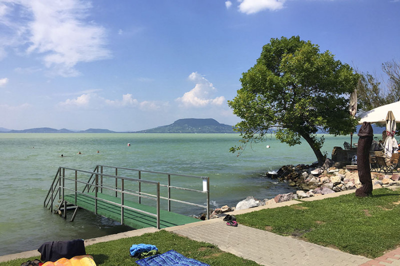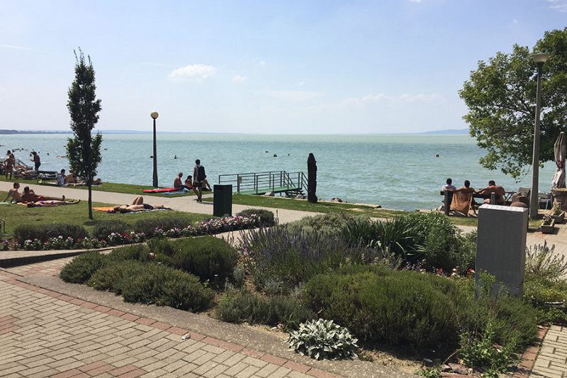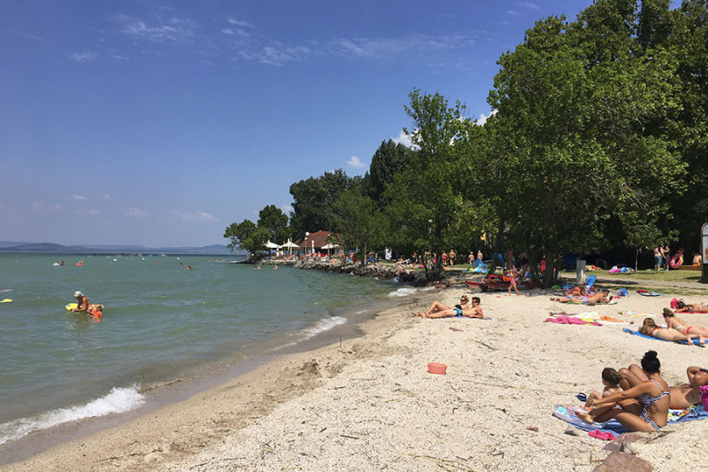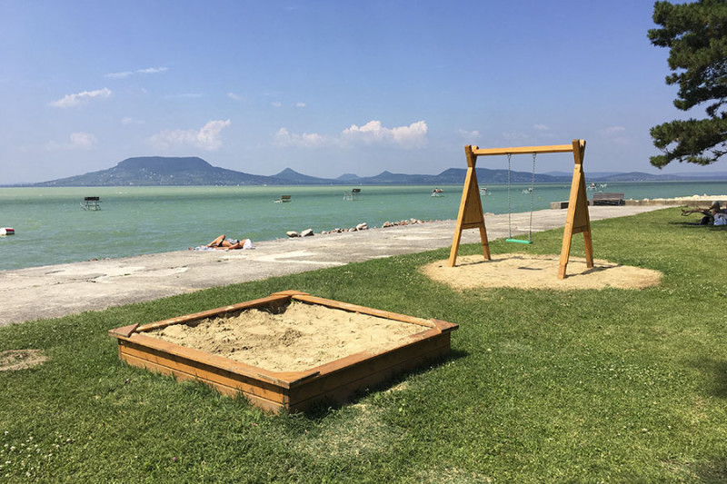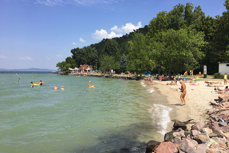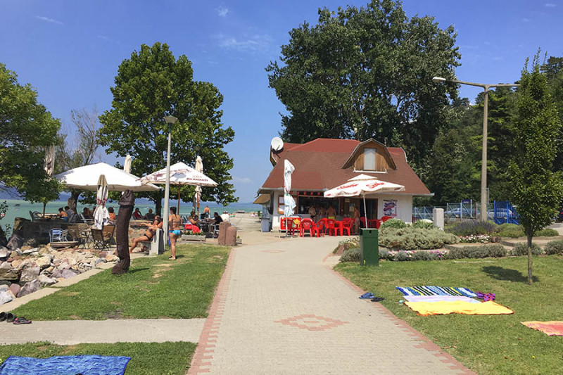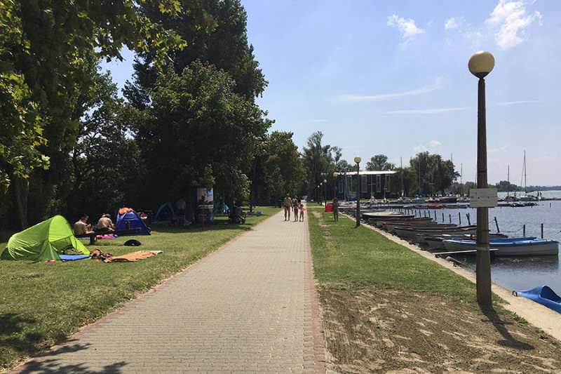 Mintegy száz méter után egy apró kaviccsal borított öbölhöz érünk, aminek sekélyebb parti részét lekerítették a legkisebbeknek. A következő szakaszon egy csónak- illetve vitorláskikötő öble ékelődik a strand területébe, majd az öböl másik szélén egy nagy füves résszel kiszélesedik a strand. Itt is találunk fákat, egy komoly játszóteret, büfét, homokos strandröplabda és lábtengópályát.