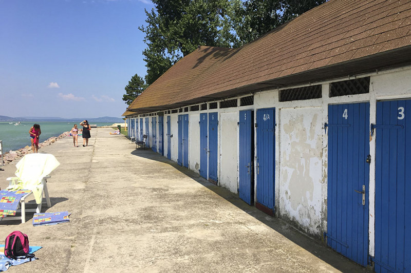 Az ingyenes strand több, egymástól nagyon különböző részből kapcsolódik össze. A bejárata a bélatelepi vasútállomásnál, közvetlenül a sínek Balaton felőli oldalánál van. Jobbra, északkeleti irányba fordulva találjuk az öltözősort. Előtte egy széles betonozott rész húzódik végig a partnak ezen a részén. Az állapota szerint lassan már nyugdíjas korú lehet az öltözőkkel együtt. Ha valaki szereti, ha alulról is sugárzik az összegyűjtött meleg a betonból, az itt kellemesen napozhat.