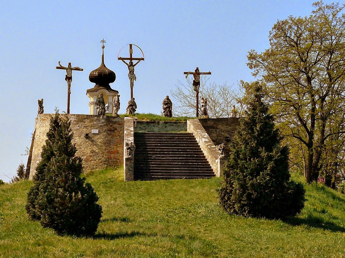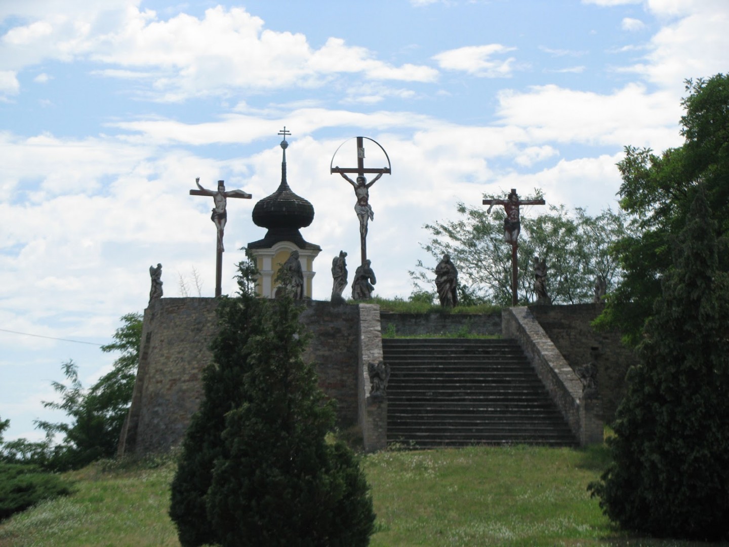 A tulajdonképpeni kálvária kiemelkedő dombjára széles kőlépcső vezet, fent áll a felfeszített Krisztus és a két lator keresztje, lábainál a Szűz Anya, János, Mária Magdolna és három angyal kőből faragott barokk szobra.