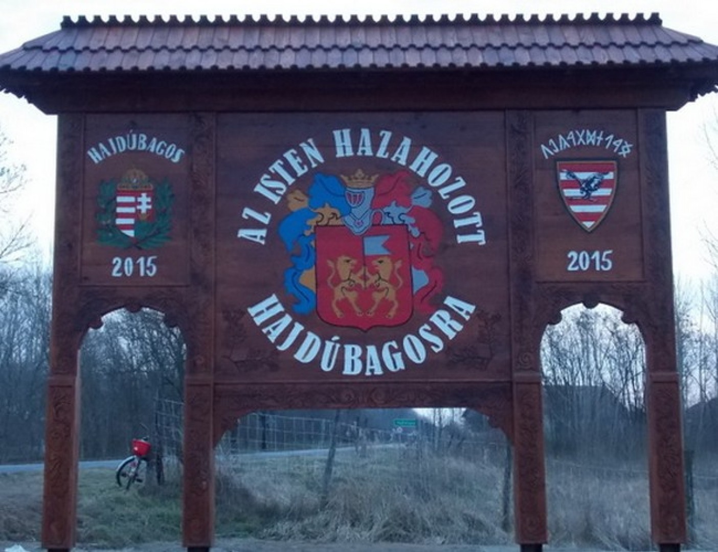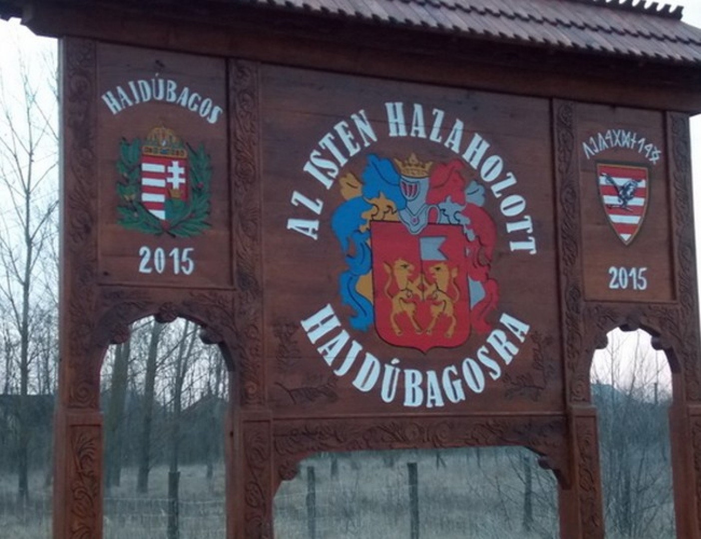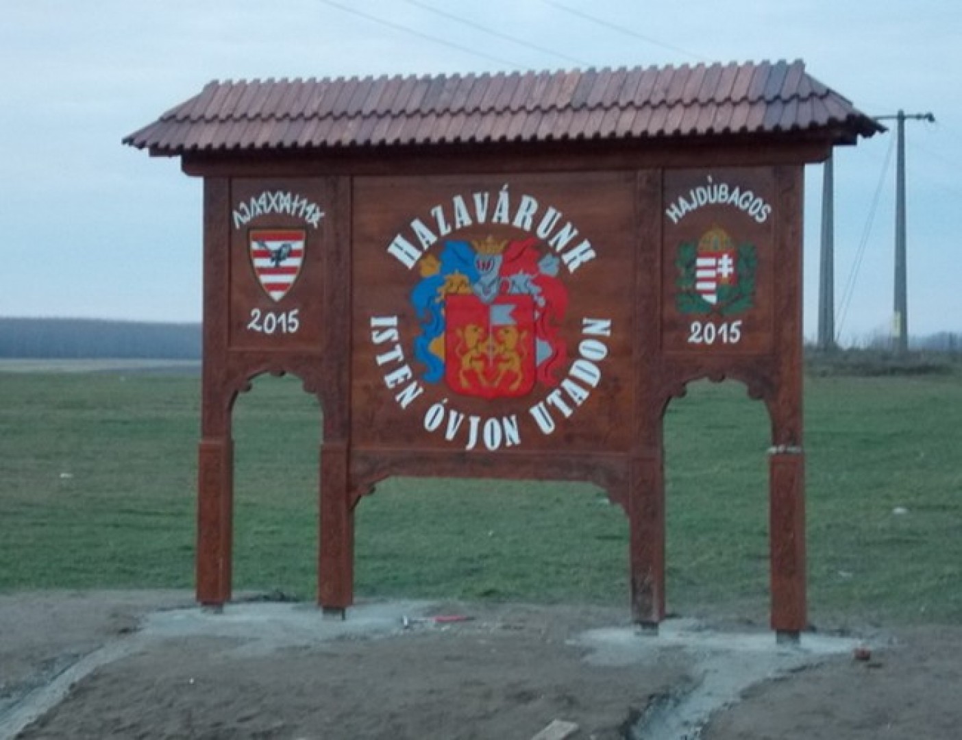 Elkészült a falu lakóit, látogatóit érkezéskor és távozáskor köszöntő tábla. Az építmény az utazó számára jelzi, hogy olyan településre érkezett, ahol a hagyományokat, a székely kultúrát beépítik a mindennapokba. Hajdúbagos új vagy felújított épületeiben megtalálhatóak a népi építészet elemei: a faragott fa és a székelykapu. Az üdvözlő táblát Szabó Lukács Imre polgármester álmodta meg és készíttette el.