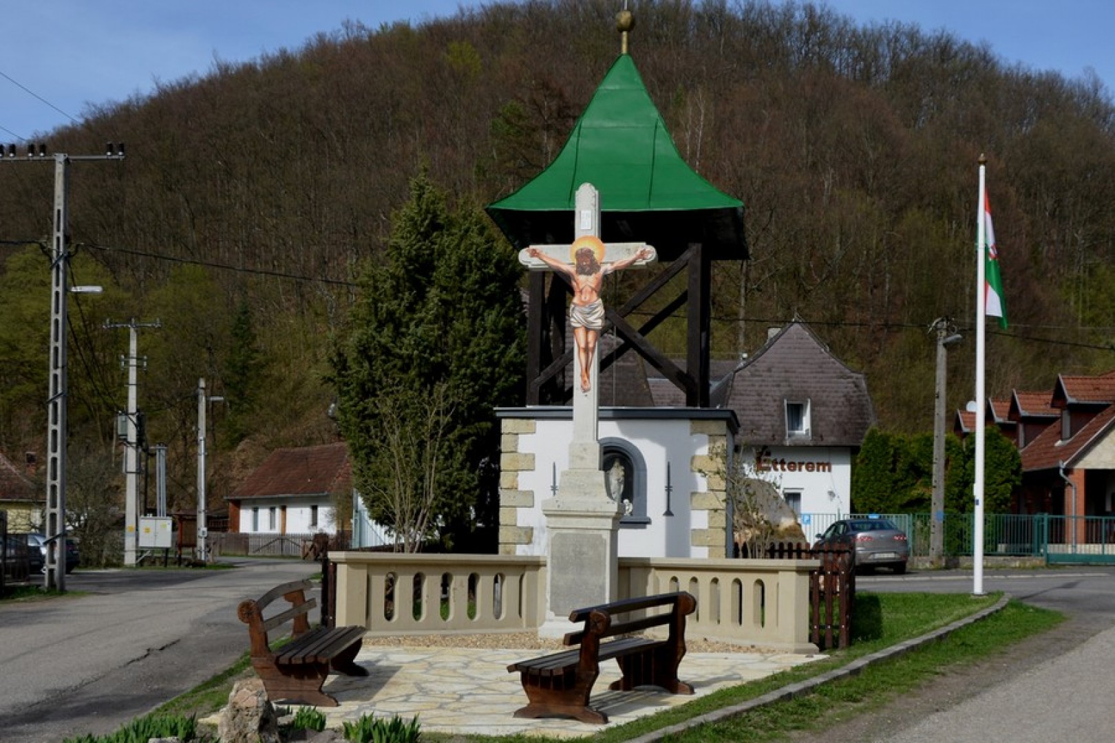 A harangláb tövében található Újhuta második világháborúban elesett hősinek emlékműve, valamint egy tájékoztató tábla, amely a falu történetét ismerteti. A feszület előtt elhelyezett padok a pihenést és a csendes elmélkedést, imádkozást szolgálják.