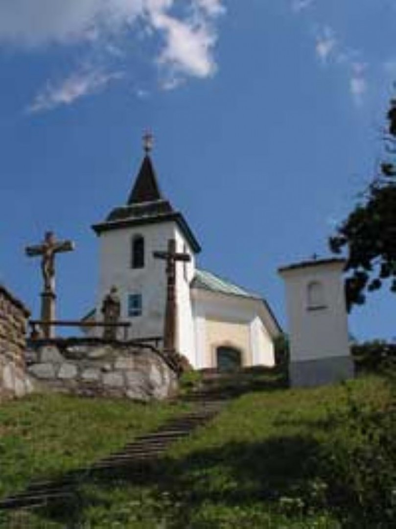 1773. augusztus 11-dikén a három kőkereszt elé a Fájdalmas Szűzanya, Szt. János apostol és a térdeplő Szt. Mária Magdolna mészkőből faragott szobraiból álló, megkapó látványú festett szoborcsoportot állítottak föl Gévay Jakab nagybörzsönyi plébános nagylelkű ajándékaként.