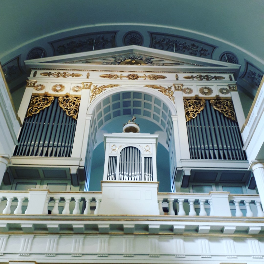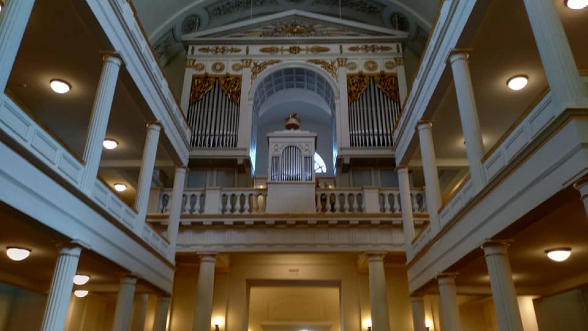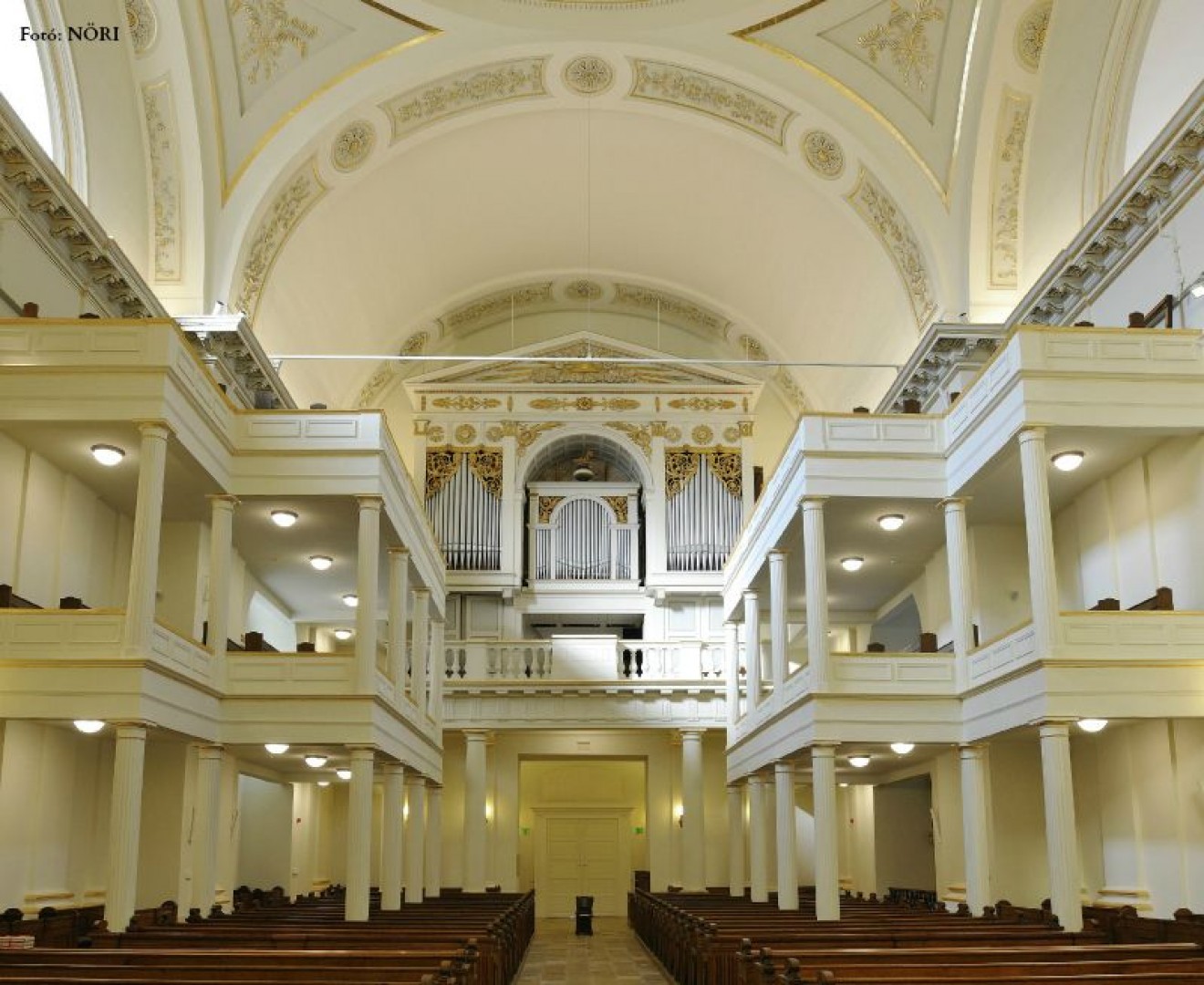 Az egy évvel később elkészült orgona a bécsi Deutschmann cég munkája, 1891-ben újította fel és nagyobbította meg a pécsi Angster cég. Az oszlopos timpanonnal zárt előcsarnokot az 1838-as árvíz utáni helyreállításokat követően, az oldalkarzatokat pedig 1854 és 1855 között, Hild József tervei szerint építették fel az angol születésű Zichy Emmanuelné Strachan Sarolta grófnő adományából. Ő ugyanis úgy végrendelkezett, hogy vagyona egy részét a karzatok felépítésére fordítsák. A templom a mai képét a toronysisak megépítésével nyerte 1859-ben. A déli oldalon levő Kálvin terem ablakain Róth Miksa üvegfestmény-sorozata keresztény szimbólumokat és neves, református egyháztörténeti személyeket – Kálvin Jánost, Bocskai Istvánt és Bethlen Gábort – ábrázol. A templom főhomlokzatából magasra emelkedik a buzogánydíszes sisakban végződő, vaskos torony. Az előcsarnokból két lépcsőház vezet fel a karzatokhoz. A monumentális hatású belső tér dongaboltozata közepében elliptikus kupola emelkedik. A földszinten korlát választja el a presbiterek helyét, melynek közepén az Úrasztal áll. A szószék fölötti hangvető Hild József műve. A templombelső fehér felületeit aranyozott stukkók díszítik.