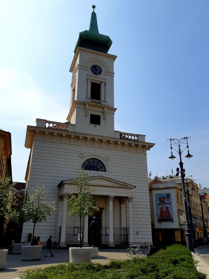 A templom klasszicista stílusban, 1816-tól 1830-ig épült Hild Vince tervei alapján. Építészeti érdekessége, hogy eredetileg két toronnyal tervezték. A soha meg nem épült két torony két külön alapja ténylegesen el is készült, s a középen álló torony ennek a két külön alapnak a belső széleire támaszkodik.