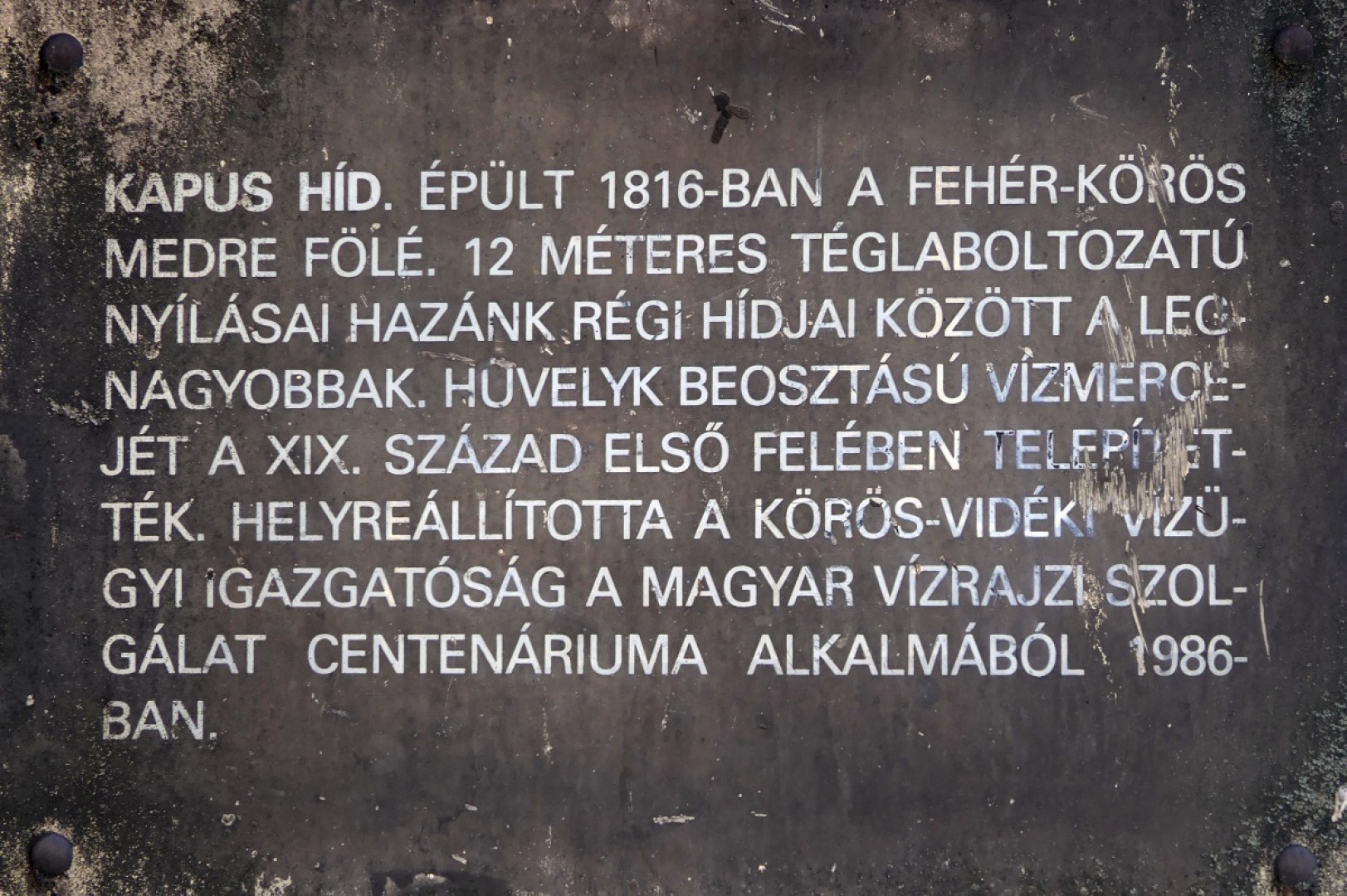 Épült 1816-ban a Körös medre fölé. 12 méteres téglaboltozatú nyílásai hazánk régi hídjai között a legnagyobbak. Hüvelyk beosztású vízmércéjét a XIX. század első felében telepítették. Helyreállította a Körös-Vidéki Vízügyi Igazgatóság a magyar vízrajzi szolgálat centenáriuma alkalmából 1986-ban
