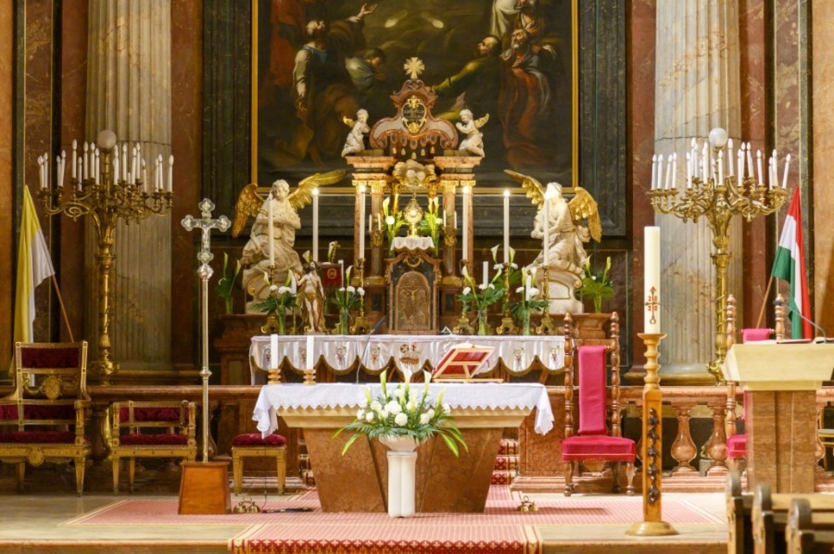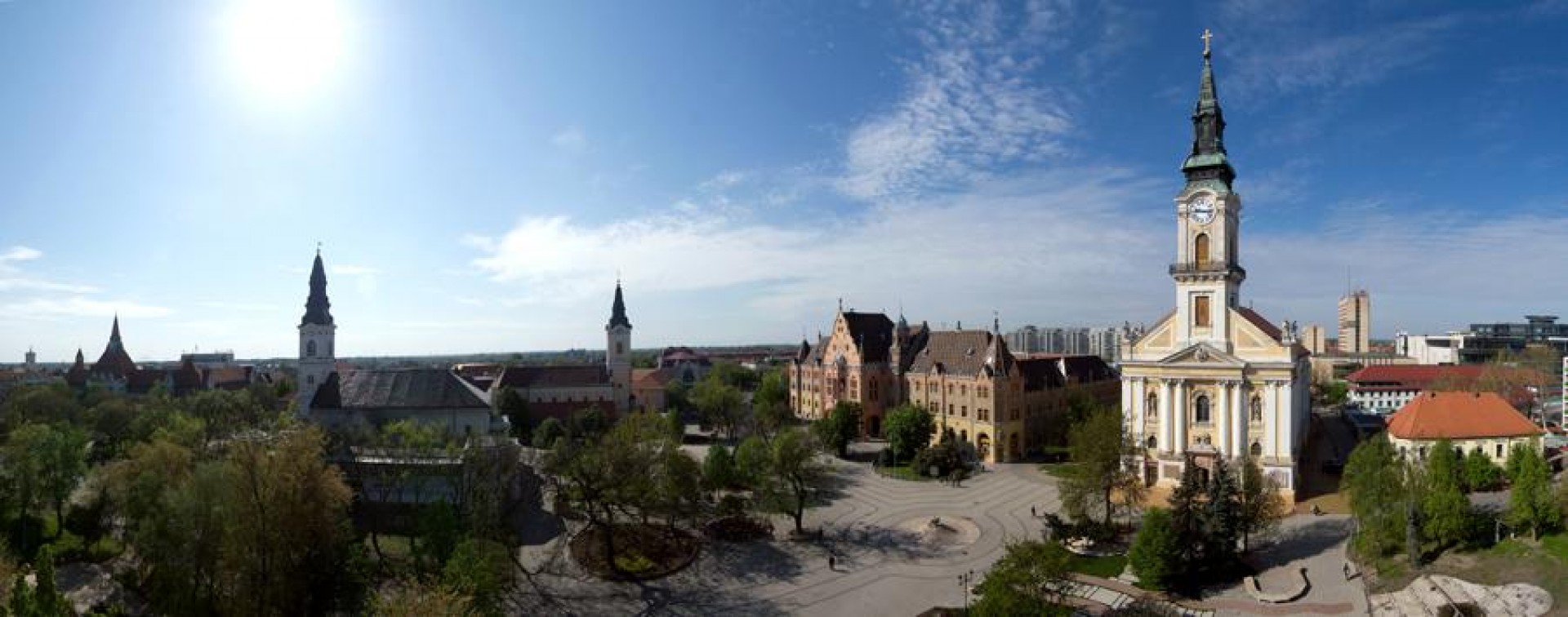 A templom-külső a hazánkban ritka klasszicizáló, későbarokk építészet szép példáját mutatja, és később egyúttal mintául szolgált az „alföldi nagytemplomnak”. Vörösmárvány kapuja feletti szoborcsoport azt a jelenetet ábrázolja, amikor Jézus átadja Szent Péternek a kulcsokat. A fülkékben Szent István és Szent László szobra, a timpanonban a „Patrona Hungariae” dombormű, a homlokzat párkányán pedig a négy evangélista szobra látható.