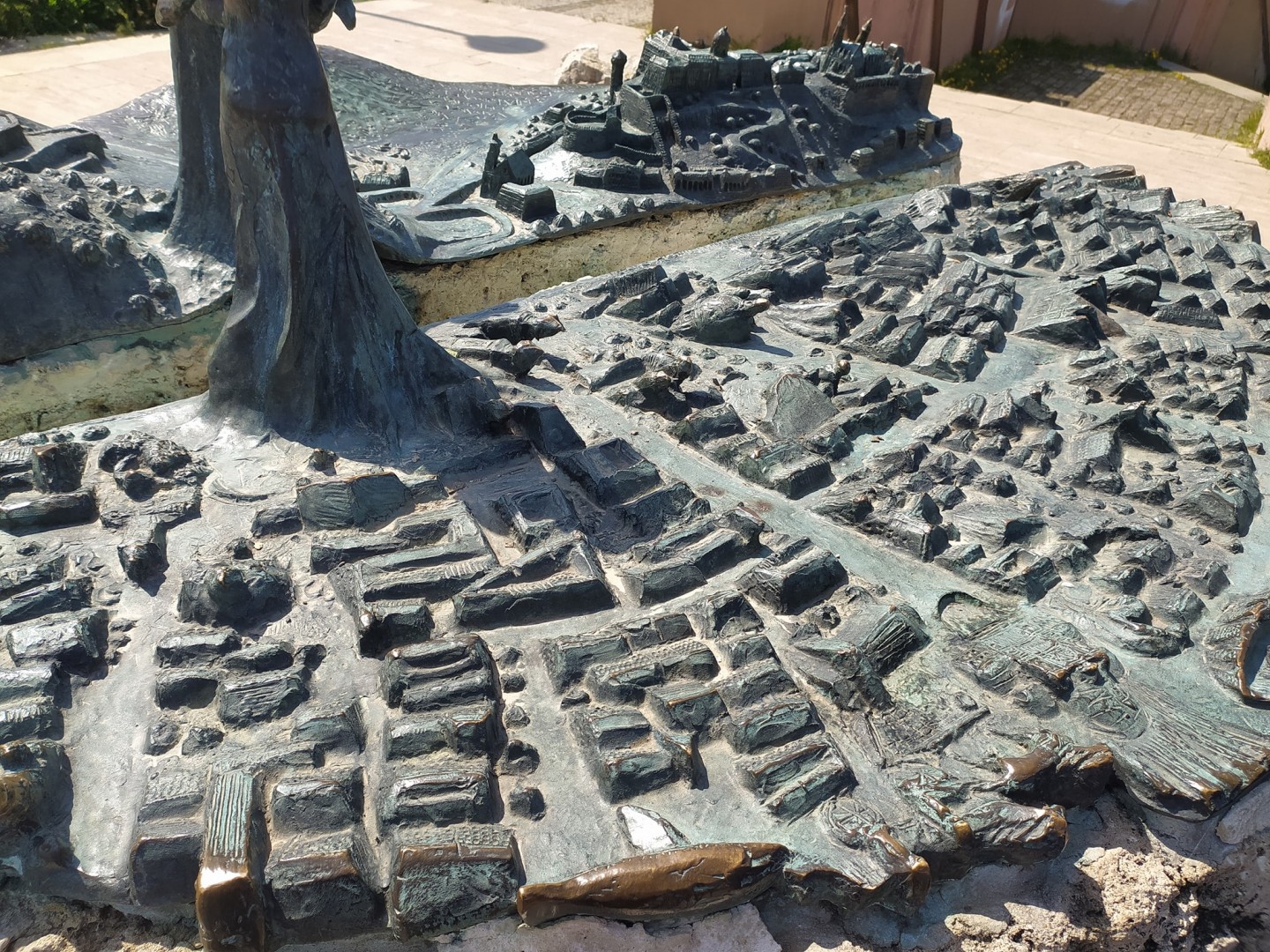 Az emberalakokat alkotó szoborkompozíció másfél méter magasságú. Lesenyei Márta készítette, de a talpazatot, melyen a városrészek tekinthetők meg terepasztalszerűen Vadász György munkássága.