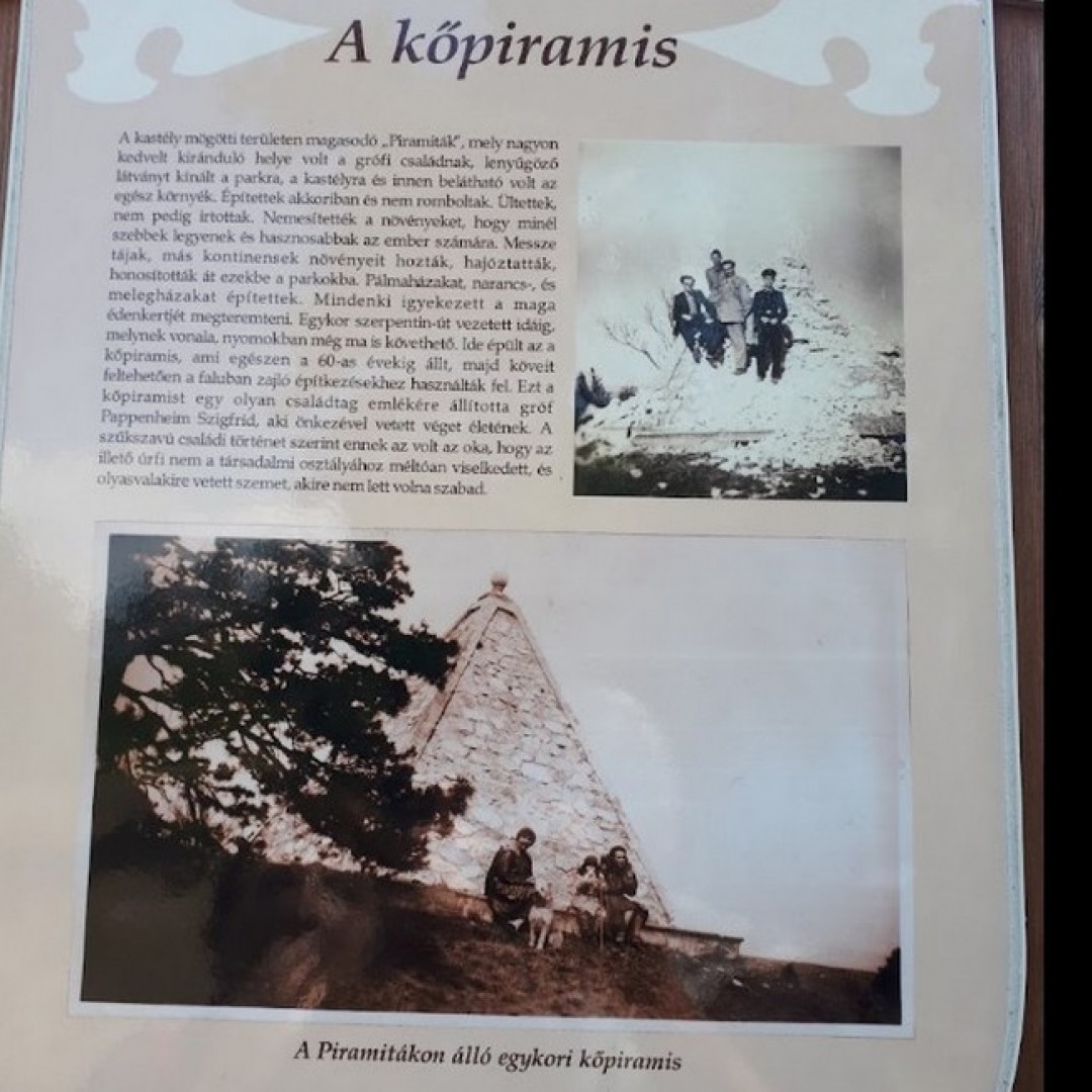 A kastély mögötti területen magasodó „Piramiták” , mely nagyon kedvelt kiránduló helye volt a grófi családnak, lenyűgöző látványt kínált a parkra, a kastélyra és innen belátható volt az egész környék. Építettek akkoriban és nem romboltak. Ültettek és nem irtottak. Nemesítették a növényeket, hogy minél szebbek legyenek és hasznosabbak az ember számára. Messze tájak más kontinensek növényeit hozták, hajóztatták, honosították át ezekbe a parkokba. Pálmaházakat-, narancs és melegházakat építettek. Mindenki igyekezett a maga édenkertjét megteremteni. Egykor szerpentin út vezetett idáig, melynek vonala nyomokban még ma is követhető. Ide épült az a kőpiramis, ami egészen a 60-as évekig állt, majd követeit feltehetően a faluban zajló építkezésekhez használták fel. Ezt a kőpiramist egy olyan családtag emlékére állította gróf Pappenheim Szigfrid, aki önkezével vetett véget az életének. A szűkszavú családi történet szerint ennek az volt az oka, hogy az illető úrfi nem a társadalmi osztályához méltóan viselkedett, és olyas valakire vetett szemet, akire nem lett volna szabad.