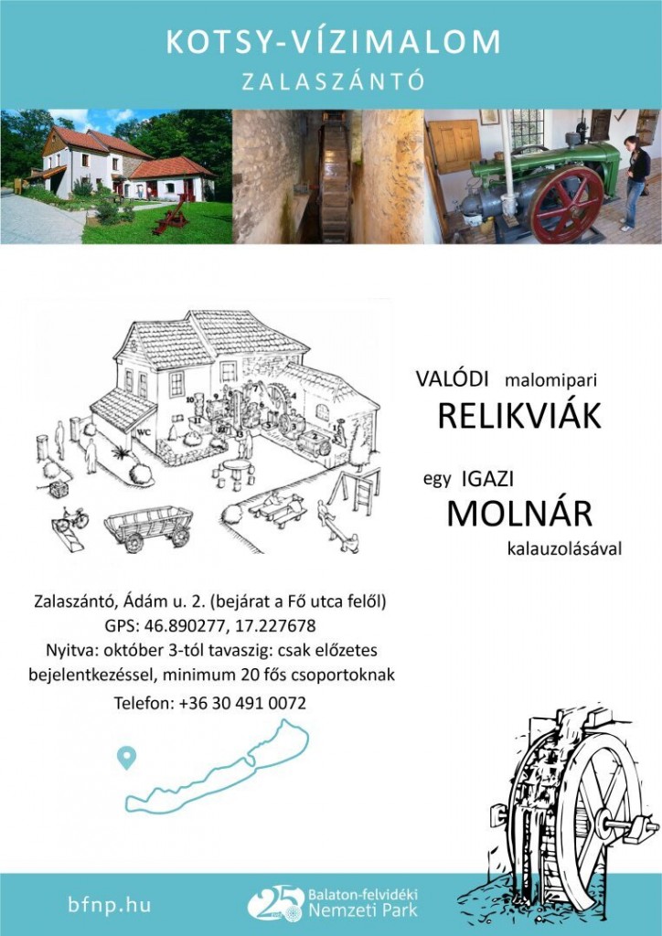 A Kotsy-vízimalom – akkoriban elhanyagolt – épületét a Balaton-felvidéki Nemzeti Park Igazgatóság 2000. januárjában vásárolta meg, magyar-svájci együttműködés keretében. A Környezetvédelmi és Vízügyi Minisztérium támogatásával 2003-ban az épület felújítása, 2004-ben a bemutatóhely kialakítása Széchenyi Terv pályázatból, 43 millió Ft támogatásból valósult meg.