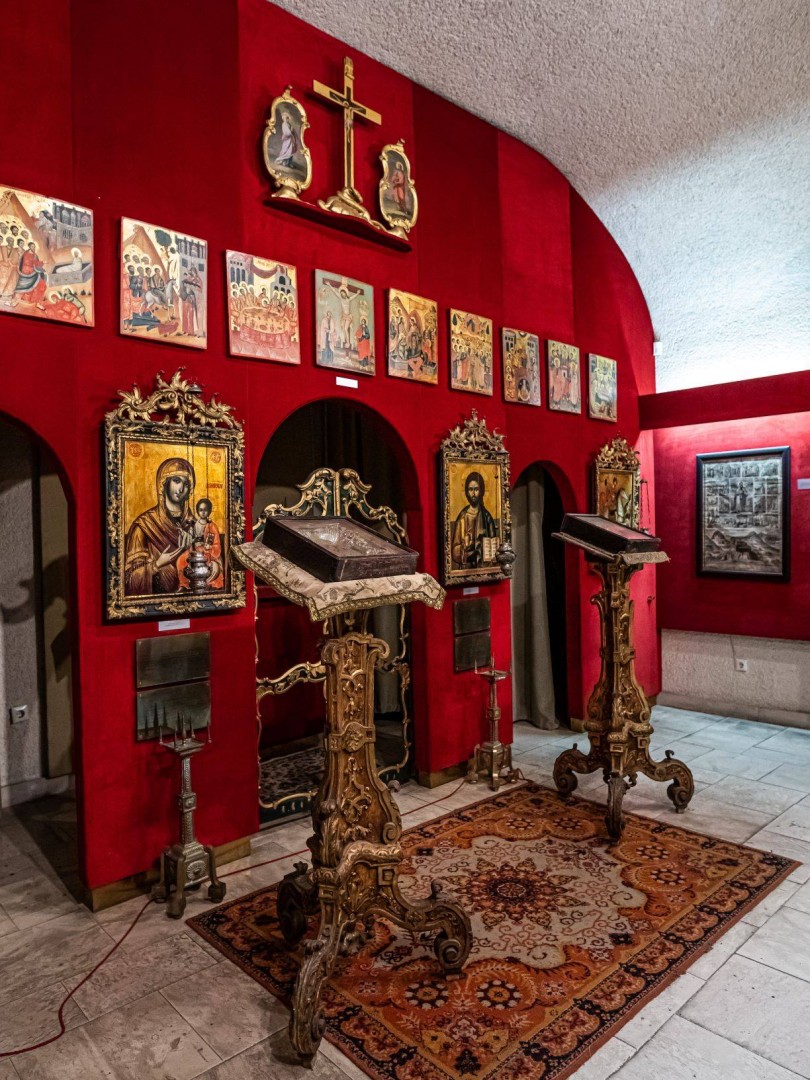 Az első terem valójában egy kápolna-rekonstrukció, melynek enteriőrjében a monumentális barokk templomok felépülte előtti istentiszteleti helyek hangulata érezhető. Ugyanitt látható a gyűjtemény grafikai kollekciójának legértékesebb része; azon belül külön figyelemre méltóak a magyarországi görög templomok rézmetszetes felszentelési ikonjai. A hasonló technikával készült vászonra, illetve selyemre nyomtatott antimenzionok az ortodox templomok legfontosabb liturgikus tárgyai.