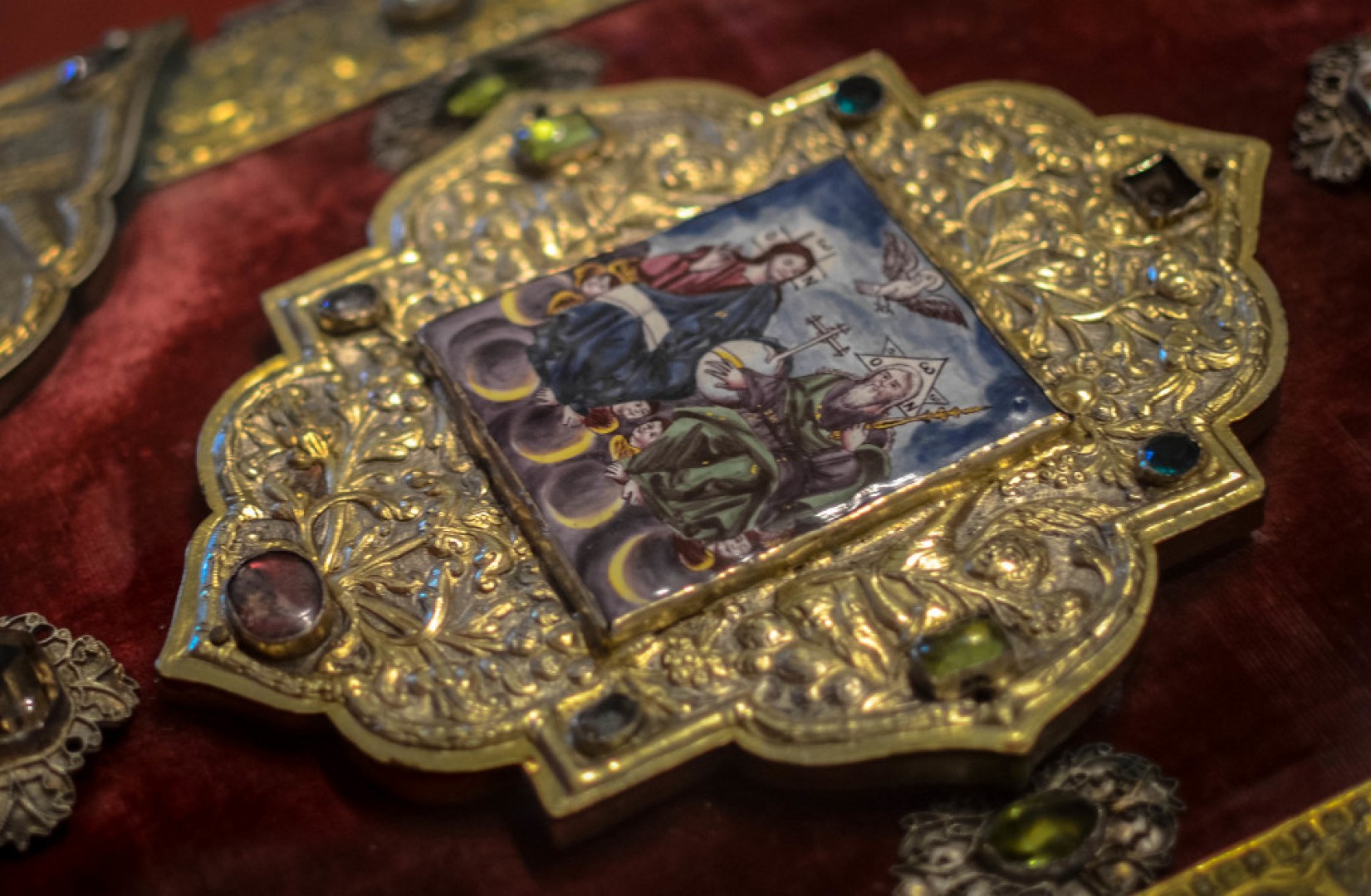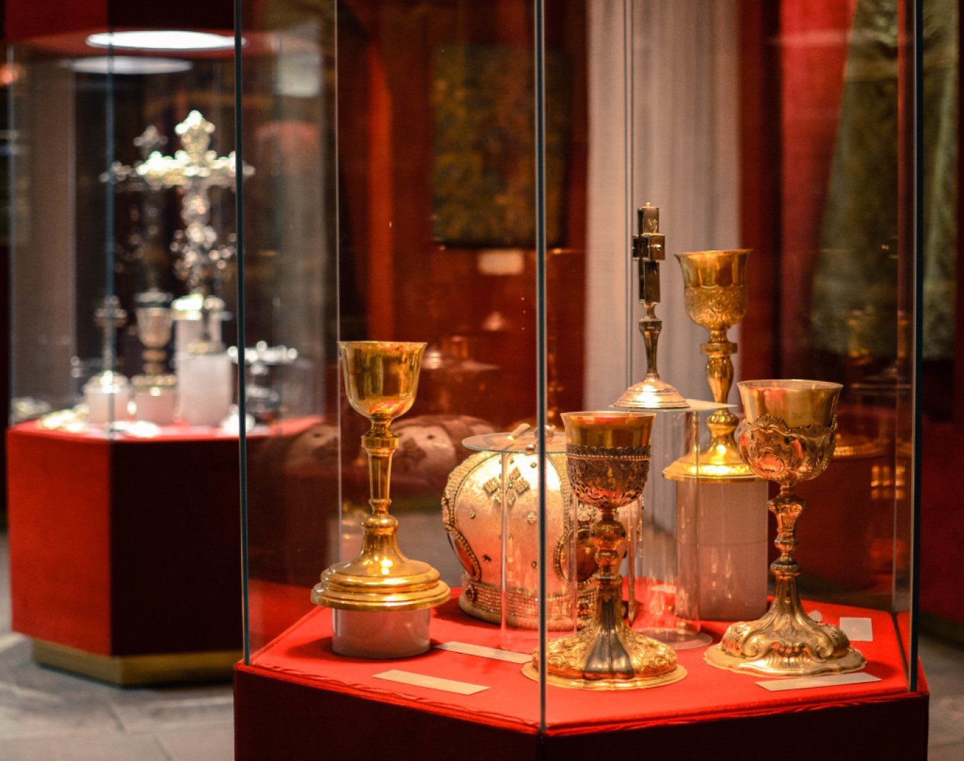 A bemutatott ötvösművek két nagy csoportba oszthatóak: az egyikben balkáni és velencei, a másikban magyarországi ötvösök szebbnél szebb, változatos technikai megoldásokkal készített remekművei kapnak helyet. A 18. század macedóniai ötvöseit dicséri a miskolci templomból származó, 1721-ben Moszchopoliszban készített, három darabból álló kollekció: kehely, oltárkereszt, püspöki hármas gyertyatartó. A hazai ötvösművészetet elsősorban pest-budai mesterek képviselik. Pazar filigrán technikával készült kereszt foglalataik, kelykeik, evangéliumoskönyv-kötéseik a magyar ötvösművészet élvonalát reprezentáló darabok.