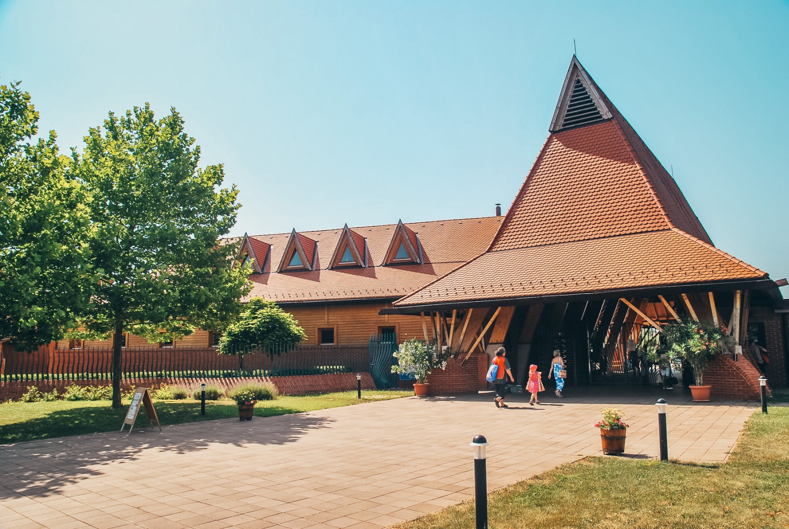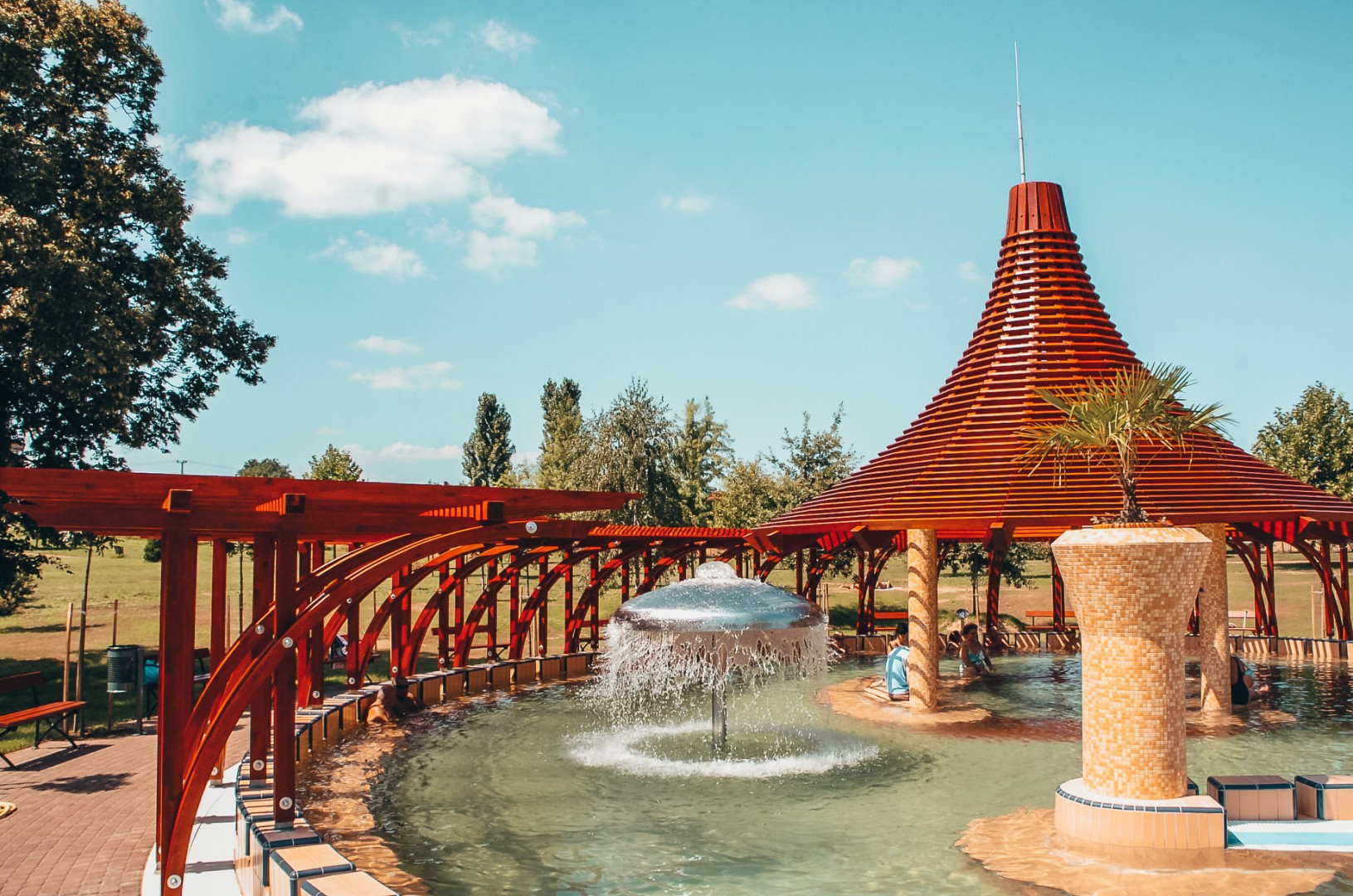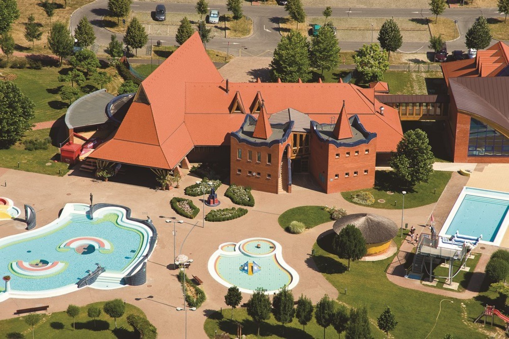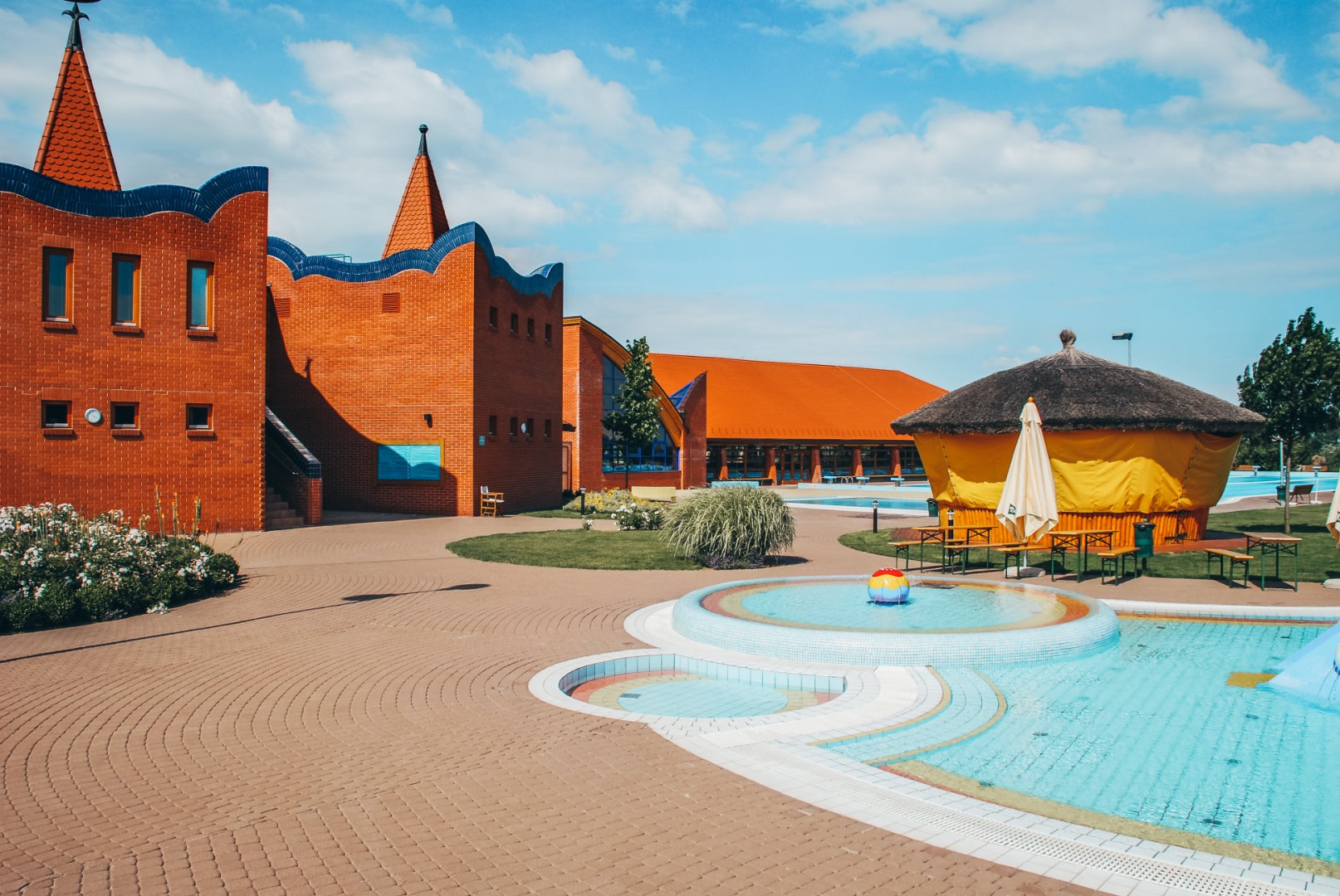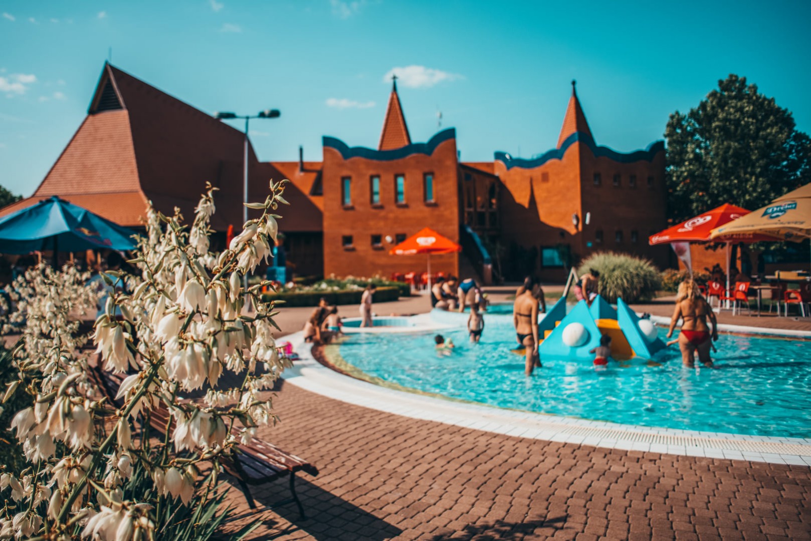 A virágokkal és dísznövényekkel teli, szezonálisan üzemelő strandon ideális kikapcsolódást biztosító napozó területek, gyógy- és termálvizes medencék, sportpályák és gyermekjátszótér várja a látogatókat.