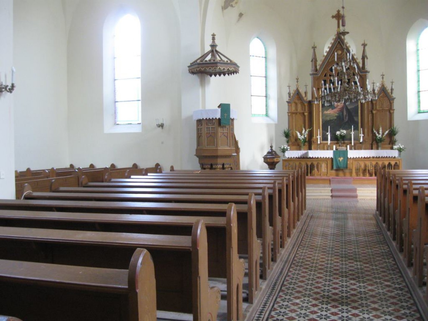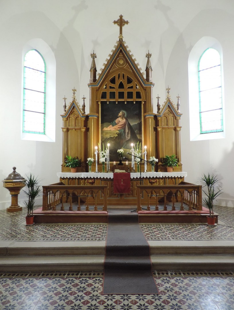 A templom oltárképe Jézus Krisztust ábrázolja a Getszemáné-kerti imája közben. A templom belsejében megtalálható Bolla Mihály, valamint a két világháború hőseinek emléktáblája. A templom hátsó részén található kovácsoltvas kereszt Verasztó Géza alkotása.