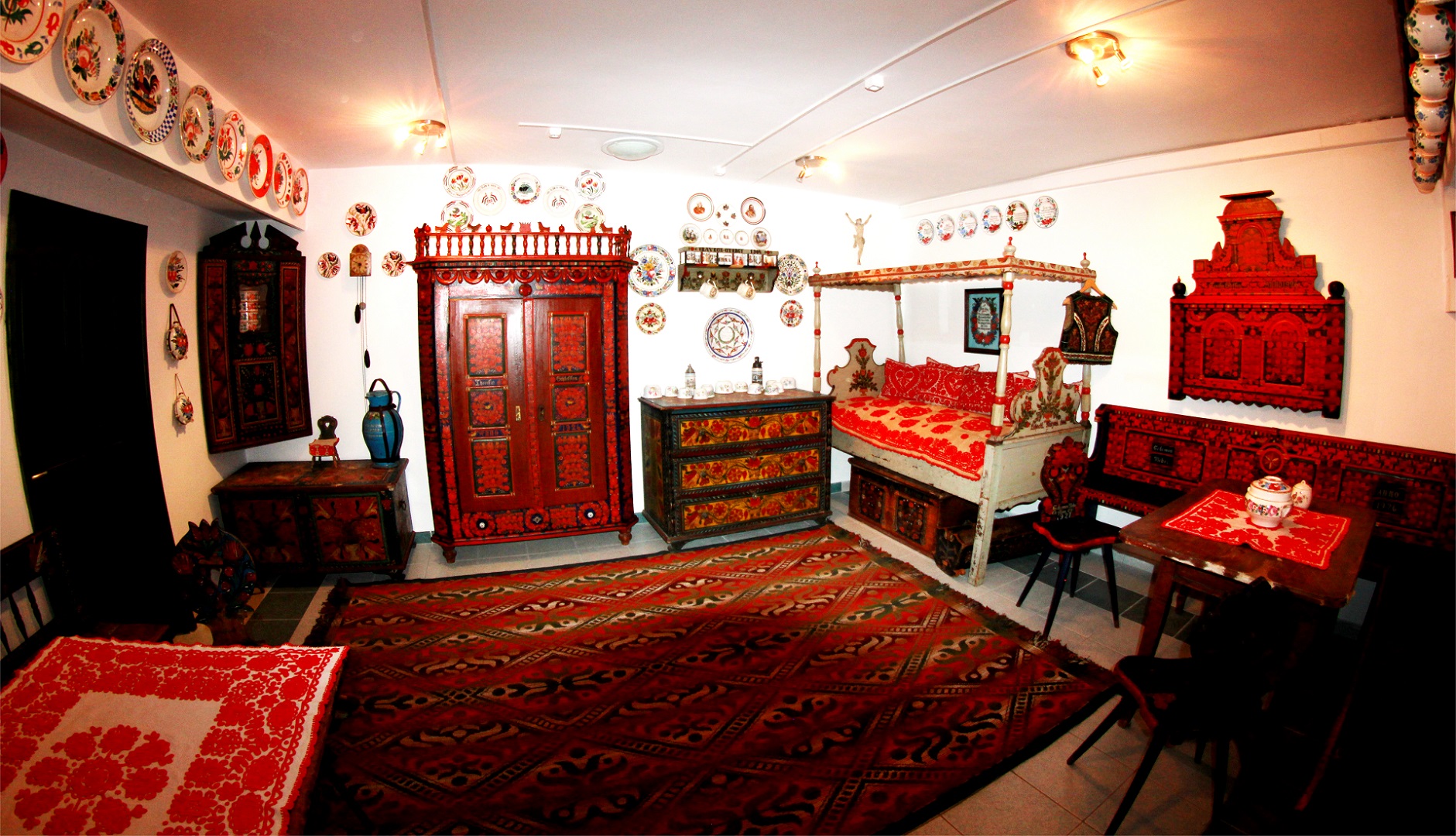 A kalotaszegi tisztaszobai enteriőr a 19-20. századforduló hagyományos felszegi lakáskultúráját mutatja be. A kalotaszegi tisztaszobát sarokra rendezték. Az asztalszög a szoba tiszteletben tartott, legtekintélyesebb része volt. Kultikus cselekményeknek, közös étkezéseknek adott helyet. Nagy becsben tartották, rendjére különösen ügyeltek. Néhol a sarkon függött a – vallásos könyvek és az orvosság őrzésére szolgáló – téka, vagy ide kerültek a nemzeti hősökről, főként Kossuth Lajosról és a szabadságharc szereplőiről készült olajnyomatok. Általában itt kaptak helyet a családi fényképek is. A sarokpad fölött függött a bokályokkal, tálakkal megrakott tálasfogas. A falat keménycserép dísztányérsorok díszítették. A sarokra állították a magas étkező asztalt is. A bejárattal szembeni padon volt a házigazda, a megbecsült vendég és általában a férfiak helye.
