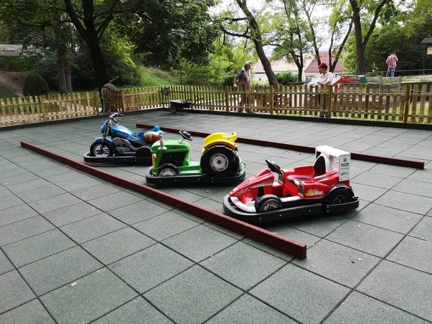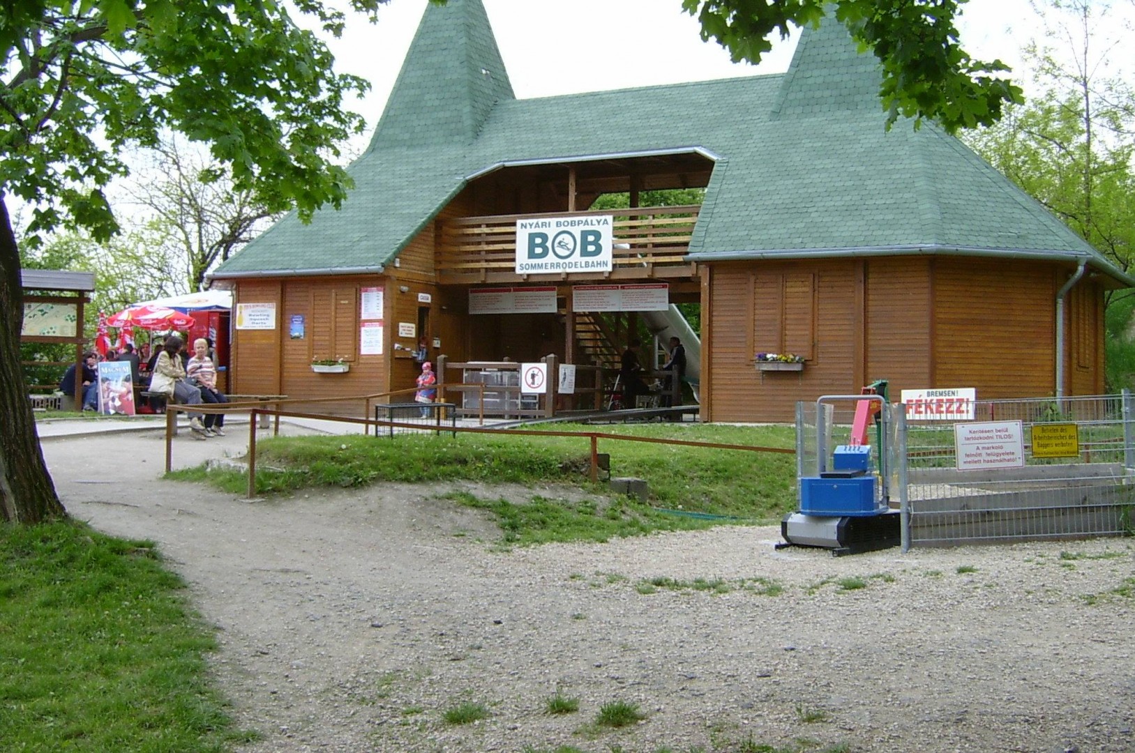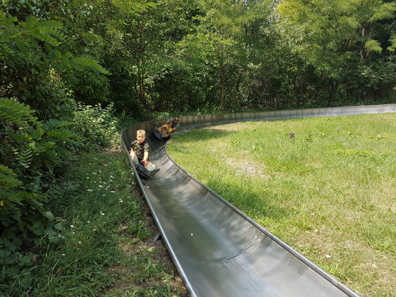 Az ingyenes parkolóból pár perc erdei séta után érünk a bejárathoz. Az árnyas fák tövében játszótér várja a kicsiket: hinta, csúszdák és egy működő kis traktor, aminek a markoló lapátjával még markolhatnak is a kis pilóták.
