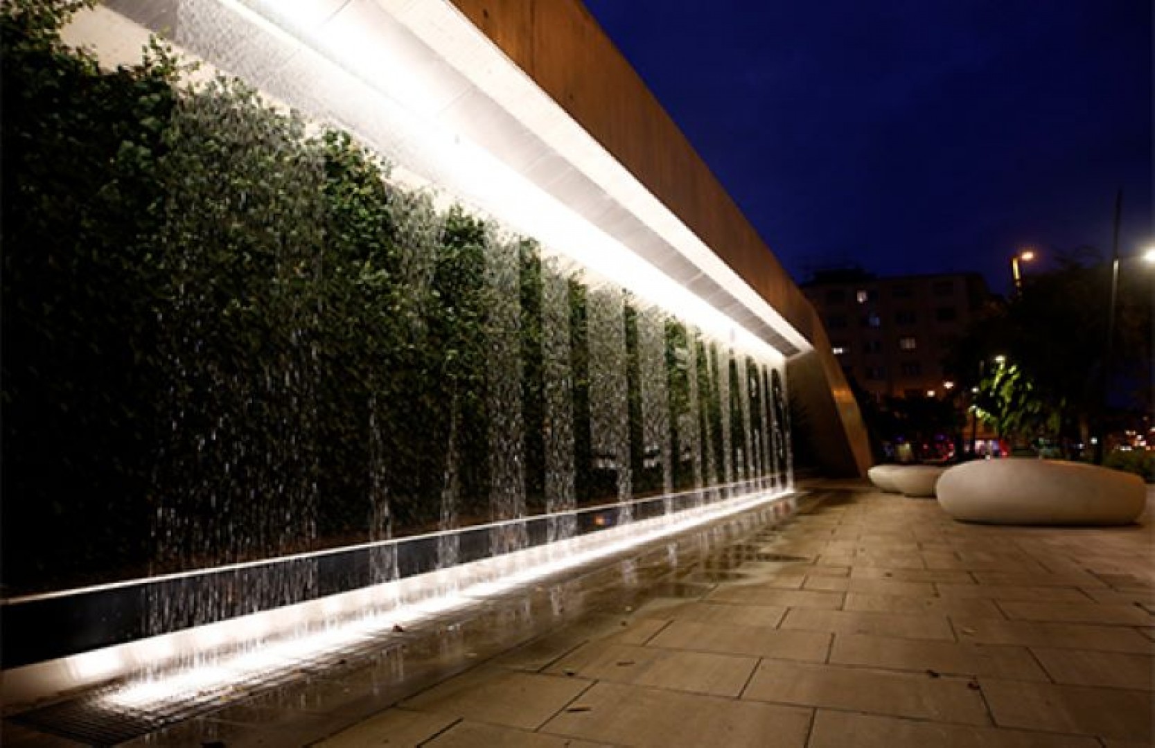 Nem messze a tótól kapott helyet a párásító fúvókákkal is felszerelt vízjáték. A színes fényekkel megvilágított, programozható vízsugarak designbeton lapokból törnek elő, amelyek felületébe stilizált, növény- és állatfajtákat megjelenítő grafikákat martak. A Margit körúti főbejárat mellett elhelyezett, látványos digitális vízfüggöny a nyári kánikulában hűti a levegőt, a lehulló vízcseppekből változatos alakzatokat vagy betűket, szavakat formál, és az erre közlekedők nagy örömére már hónapok óta működik!