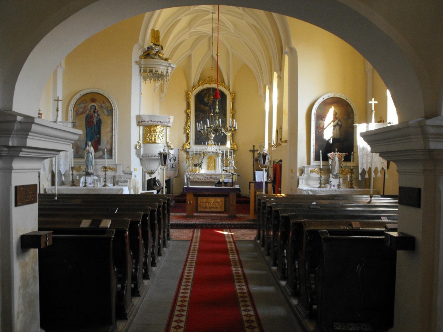 Három boltszakaszos, támpilléres hajóját és ugyancsak támpilléres és háromszakaszos, keskeny, nyújtott, sokszög záródású szentélyét csillagboltozatok fedik.