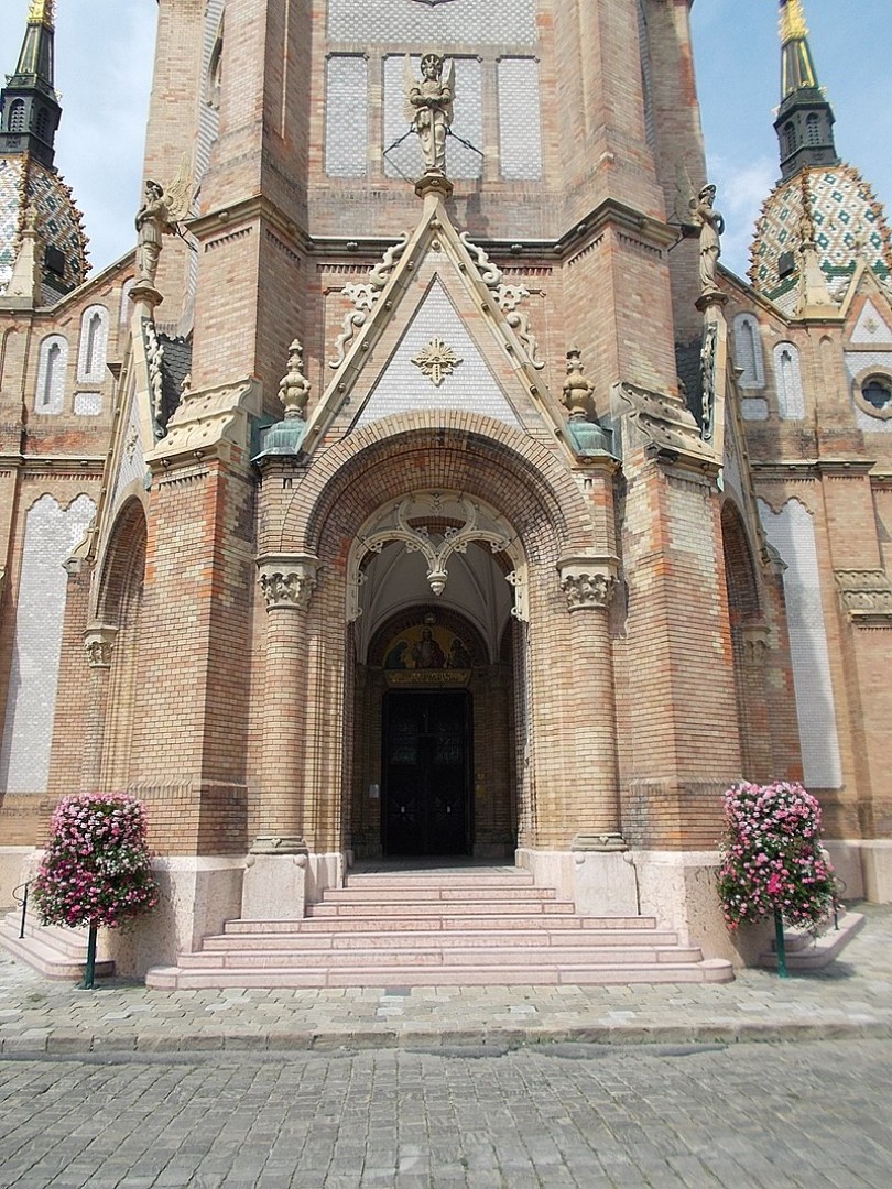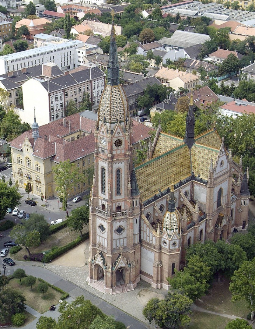 A tervező a franciaországi korai román kori és gótikus stílus jegyeit ötvözte reneszánsz, barokk, perzsa és magyar népi elemekkel, mesterien egységessé formálva az épületet. A háromhajós, kereszthajós bazilikás felépítésű templom főhomlokzatán egy hatszög szelvényű nagytorony ugrik előre, amelynek földszinti része a főbejárathoz nyitott előcsarnokot alkot. A nagytorony jobb és baloldalán elhelyezett két kápolnán szerényebb kialakítású két kistorony látható.