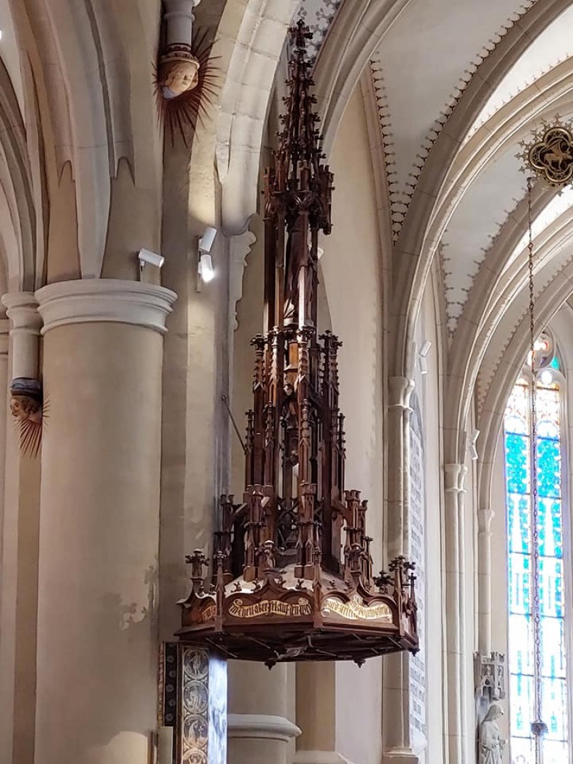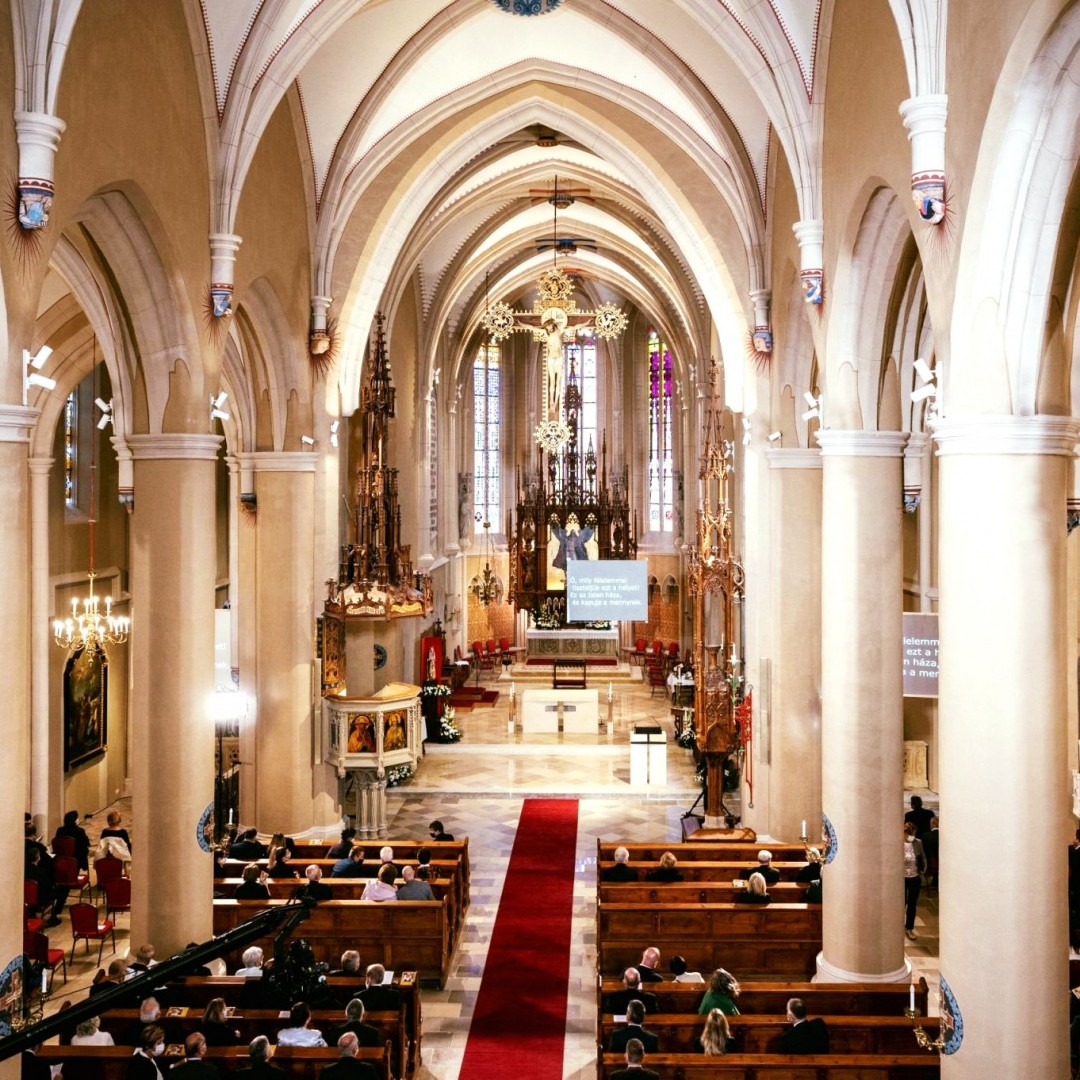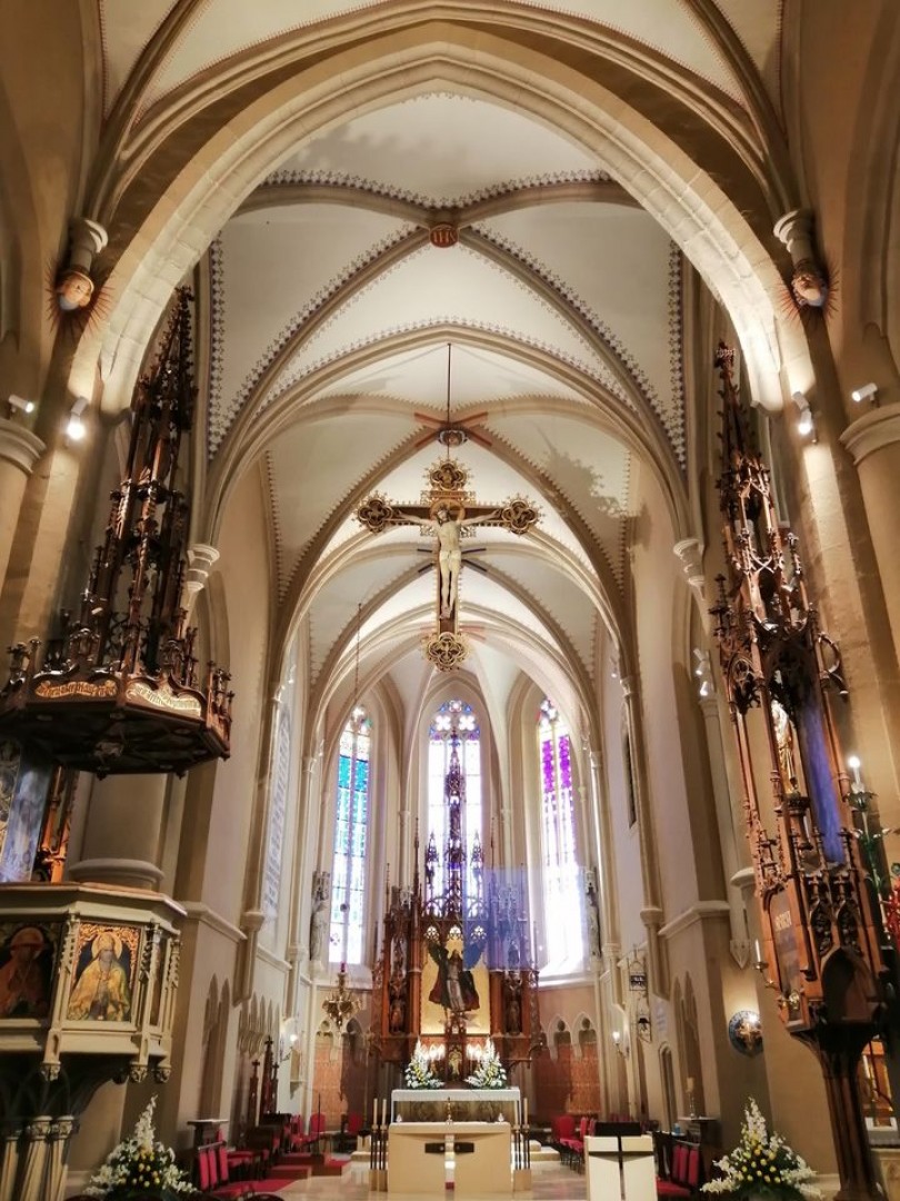 A kettősség a főhajó szentélyében a legteljesebb: a Storno Ferenc tervezte neogótikus oltárépítmény szerencsésen erősíti az égbe törő gótikus kőbordák lendületét.