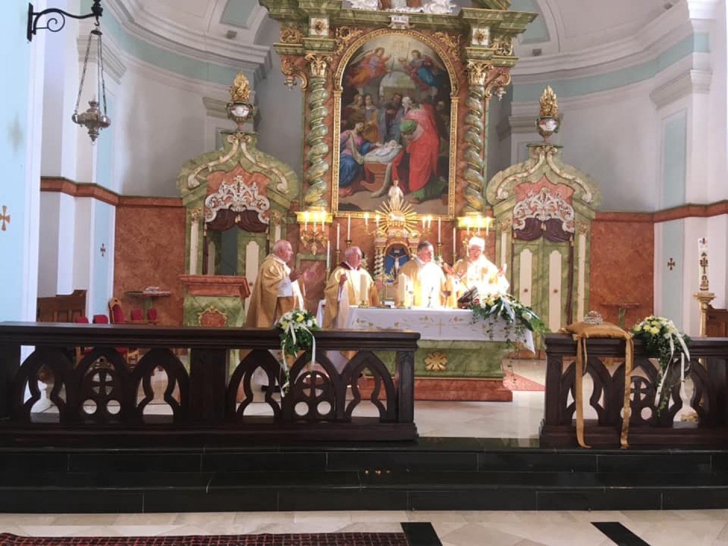 A munkálatokból kivették részüket a kispapok, bencés diákok, belga fiatalok, valamint az egyházmegye több egyházközsége is. Az építkezés megfeszített menetében kis reményt keltő színfoltok voltak az altemplomban tartott 1985. és 1986. évi éjféli misék, valamint 1986. évi mindenszenteki szentmisék és imaóra. Lelkesedésünket és kitűzött szentelési dátumunkat nem tudta megtörni az 1986-87, évi erős és hosszú tél, valamint az építkezési munkálatokat nagyon hátráltató csapadékos tavasz. 1987. június 6-ra Pünkösd vigiliájára a templom és a hozzátartozó plébánia együttes olyan mértékben elkészült, hogy szentelhetővé vált. A szentelést megyésfőpásztorunk felkérésére Dr. Paskai László esztergomi érsek végezte, Dr. Pataky Kornél püspök, Dr. László István kismartoni megyéspüspök, valamint Dr. Szennay András pannonhalmi főapát úrral együtt koncelebrálva. A szentelésen egyházmegyénk papsága szép számmal vett részt.