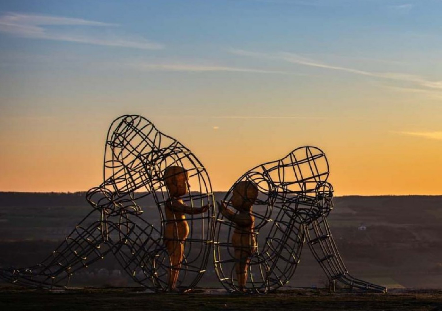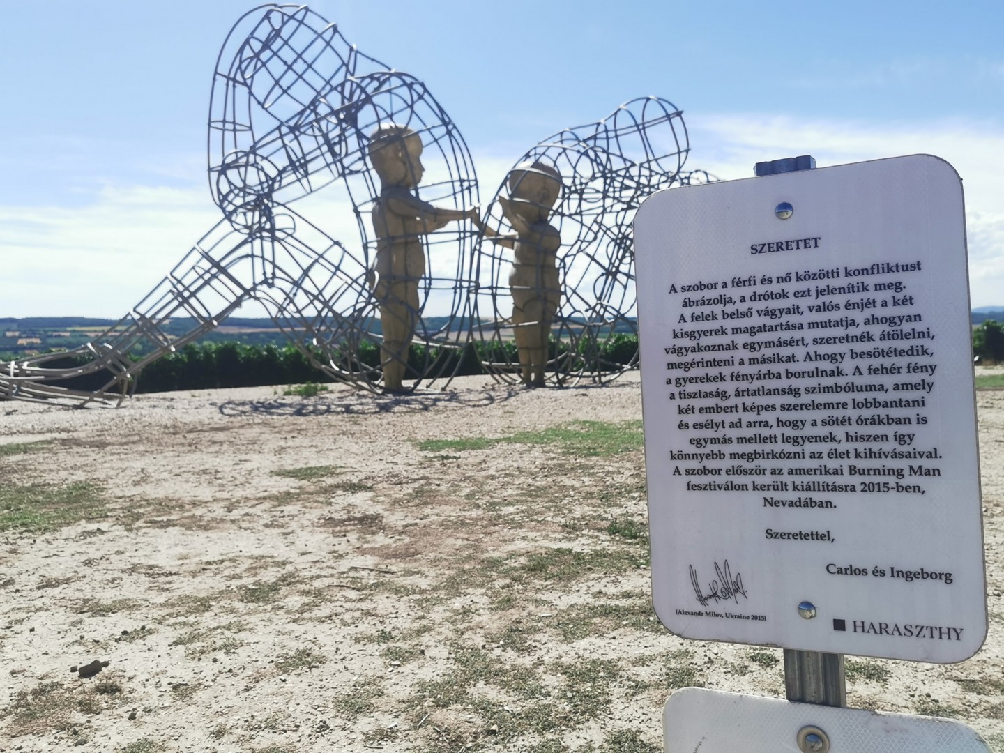 A LOVE-szobor két, egymásnak háttal ülő, magába forduló, drótokból megformázott nőt és férfit, s a bennük „élő” két egymás felé forduló, kezüket a másik irányába nyújtó gyermeket ábrázol.