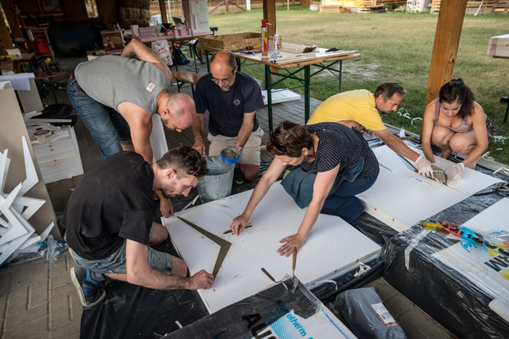 A betonszobrokat bemutató szoborpark Szigetmonostor Faluház udvarán található.