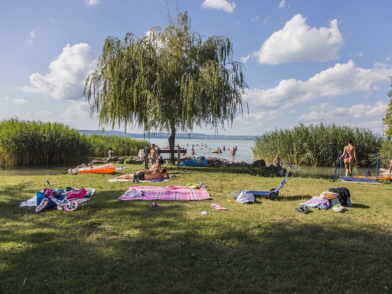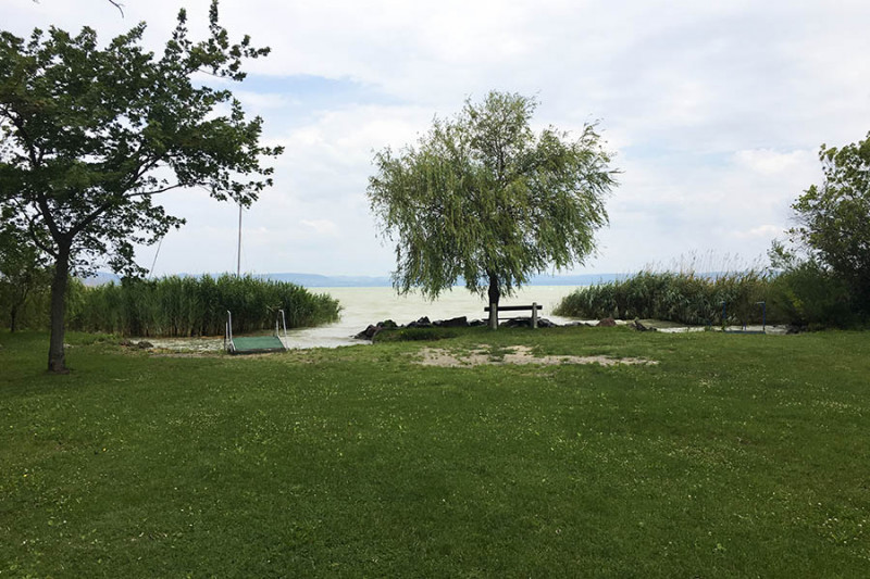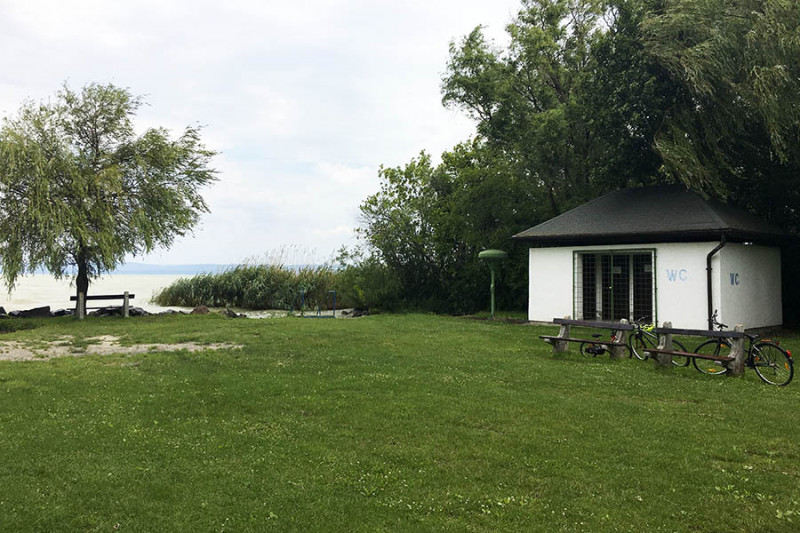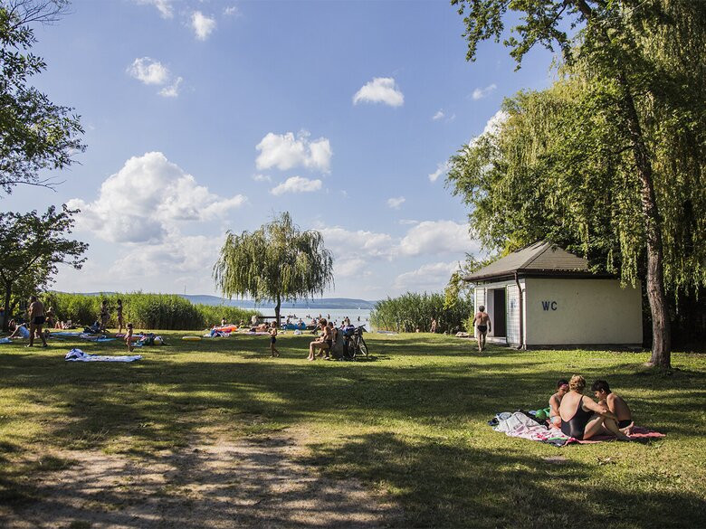 A büfé után nem sokkal található a szociális épület elsősegélynyújtó helyiséggel, valamint férfi és női WC-vel. A strandon érdekes alakú zuhanyzó áll. A területet nagy fák veszik körbe, így bőven lehet árnyékot találni. A szárazföld két kis öbölszerű résszel találkozik a vízzel. Mindkét öböl lassan mélyül, így lépcső nélkül lehet a Balatonba jutni.