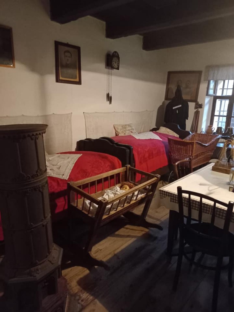 Az ágyak mögött fehér hímzett falvédők, ugyanez a motívum ékesíti az asztal, komód és a két ablak közötti láda terítőit is. A komód felett a császári családot ábrázoló színes nyomat, balra az ajtó mellett a fohászkodó I. Ferenc József és imája. A tornácra néző ablak előtt egy szerény kis iskolapad áll, amelyet a szülők készítettek gyermekeiknek a II. Világháború után. E szoba ékessége még a harmincas években készült vas kerekű, gyékény fonatú gyerekkocsi és a faragott bölcső. Az asztalon lévő üvegvázában a hét búzaszál a hét napjait, a négy szál búzavirág az évszakokat szimbolizálja.