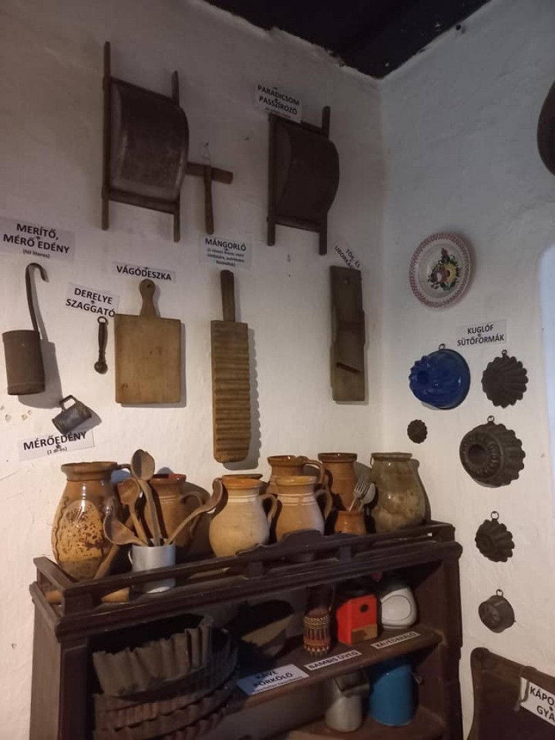 A tisztaszobába vezető ajtó mellett a dísztörülköző tartó, másik oldalon egy falba épített kis szekrény, a "kaszli". A bejárati ajtó másik oldalán a "vizes pad", az elengedhetetlen vödörrel és ivóvizes kannával. A konyha közepén asztal áll, mellette karos lóca. Ennek folytatásában a konyhai segédeszközöket rejtő polc (a stelázsi). A konyha falán pihen a templom gerincét hajdan díszítő szélkakas is.