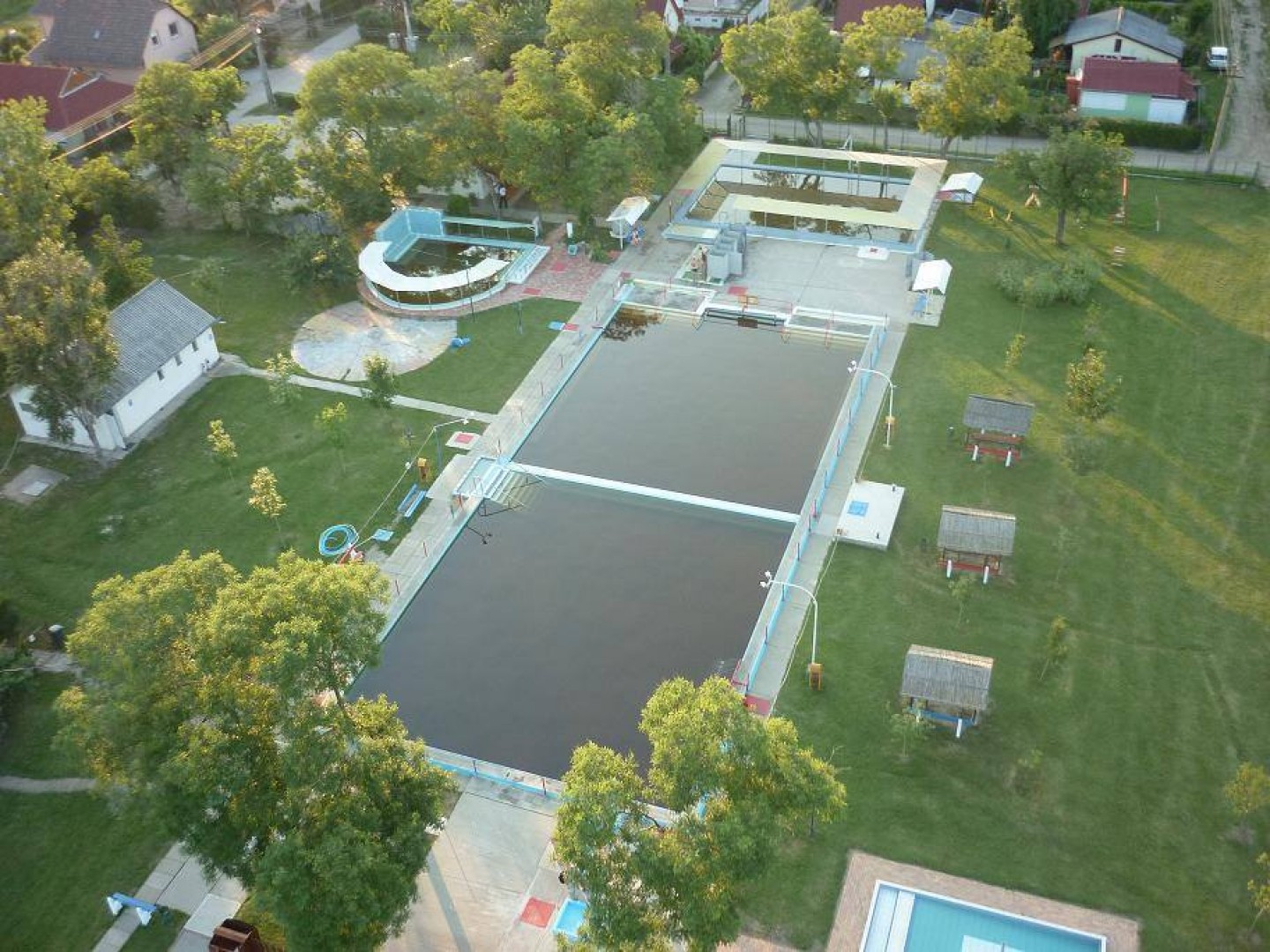 A strandfürdő hat nyitott medencével rendelkezik. Ebből kettő 200m³ feletti nagyméretű ülőpados gyógymedence élményelemekkel ellátva. Egy kisebb 108m³-es élménymedence dögönyöző elemekkel, és egy szabálytalan alakú nagy hőfokú (37-39C°) kisebb medence. Mindenki kedvére válogathat 31-39C°-ig a medencék között. A gyermekpancsoló medence napvitorlával fedett, vízforgatóval ellátott. Az úszómedence szabványos 33-m-es, feszített víztükrű, vízforgatott. Napozóterasz, és a hűsölésre alkalmas 2 hektáros tölgyerdő szintén rendelkezésre áll.