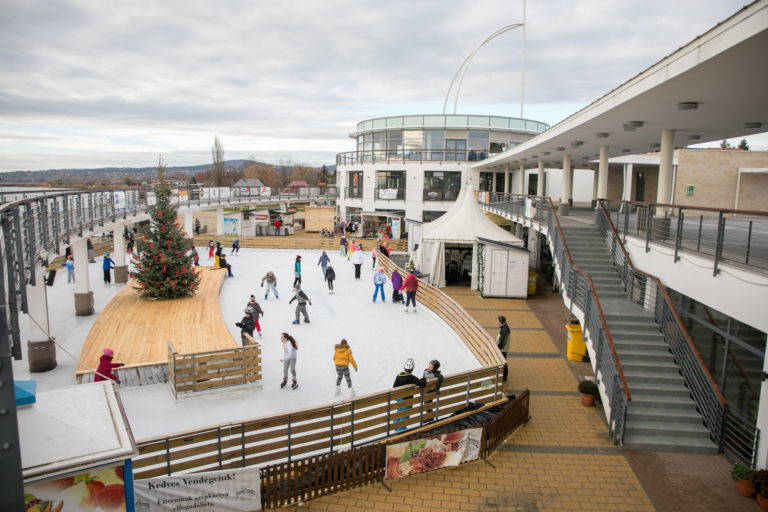Teljesen nyitott jégfelület várja a korcsolyázni vágyókat minden nap a létesítmény főterén, a szökőkút medencéje, illetve a Korzó karácsonyfája körül. Ez különleges hangulatot kölcsönöz a korcsolyázóknak.