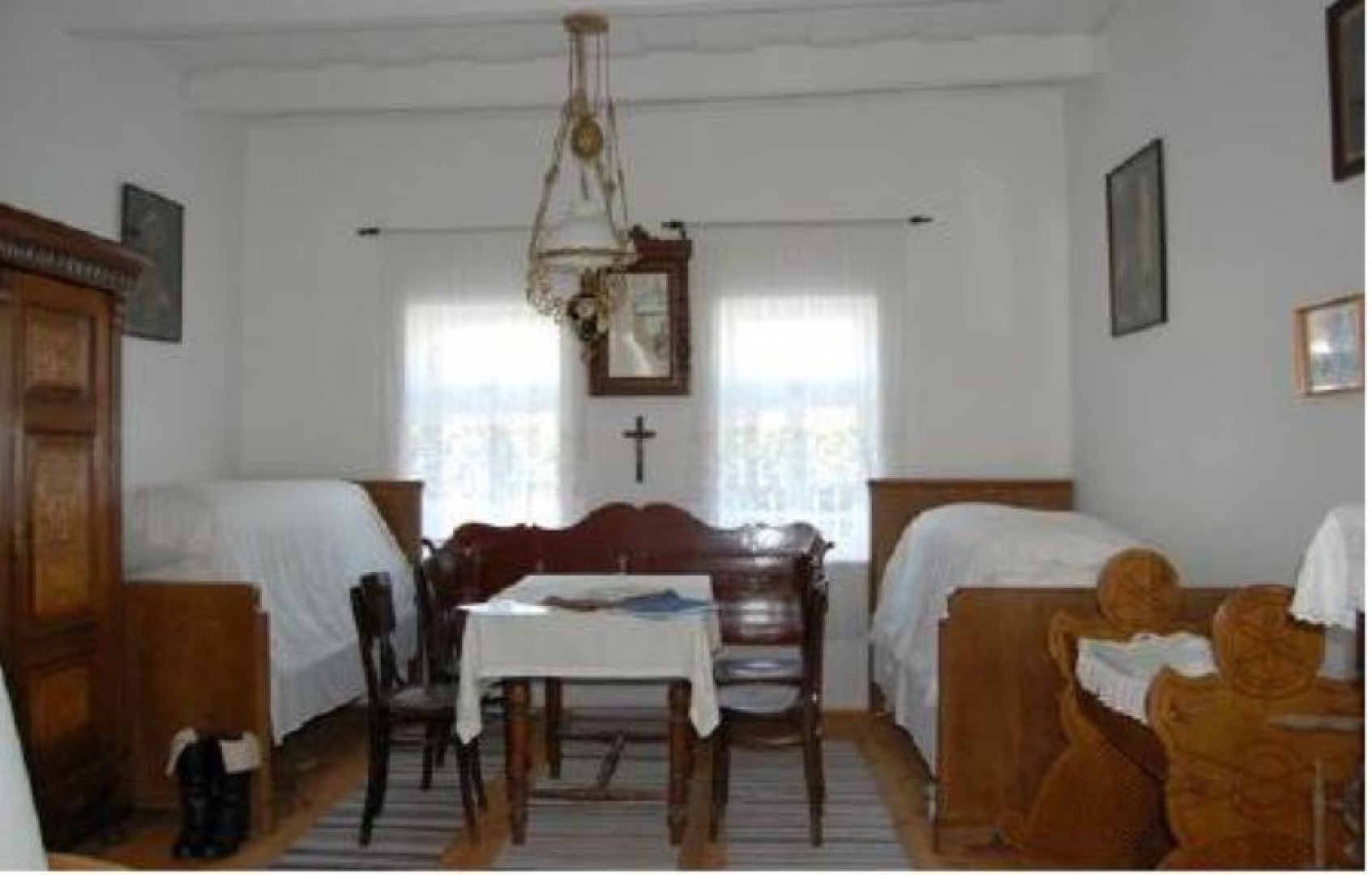 A szoba mennyezete gerendás, fehérre festett deszkás. Földje padlós, ami a régi időkben agyag padozatú volt, rajta háziszőttes pokróc, szőnyeg van. A bejárati ajtó mellett helyezkedik el a kemence, a padkával, suckóval. A kemence volt a „központi fűtőtest” a lakásban, télen naponta kétszer fűtöttek benne. Hetente volt kenyérsütés. A két oldalon helyezkednek el a szekrény a sublót, valamint a két ágy. Az ablakok előtt a kanapé, ez volt a gazda fő helye. A két ablak közötti részen van a díszes, faragott tükör, alatta a feszület. A kanapé előtt áll az asztal négy székkel, felette helyezkedik el a díszes csigáslámpa.